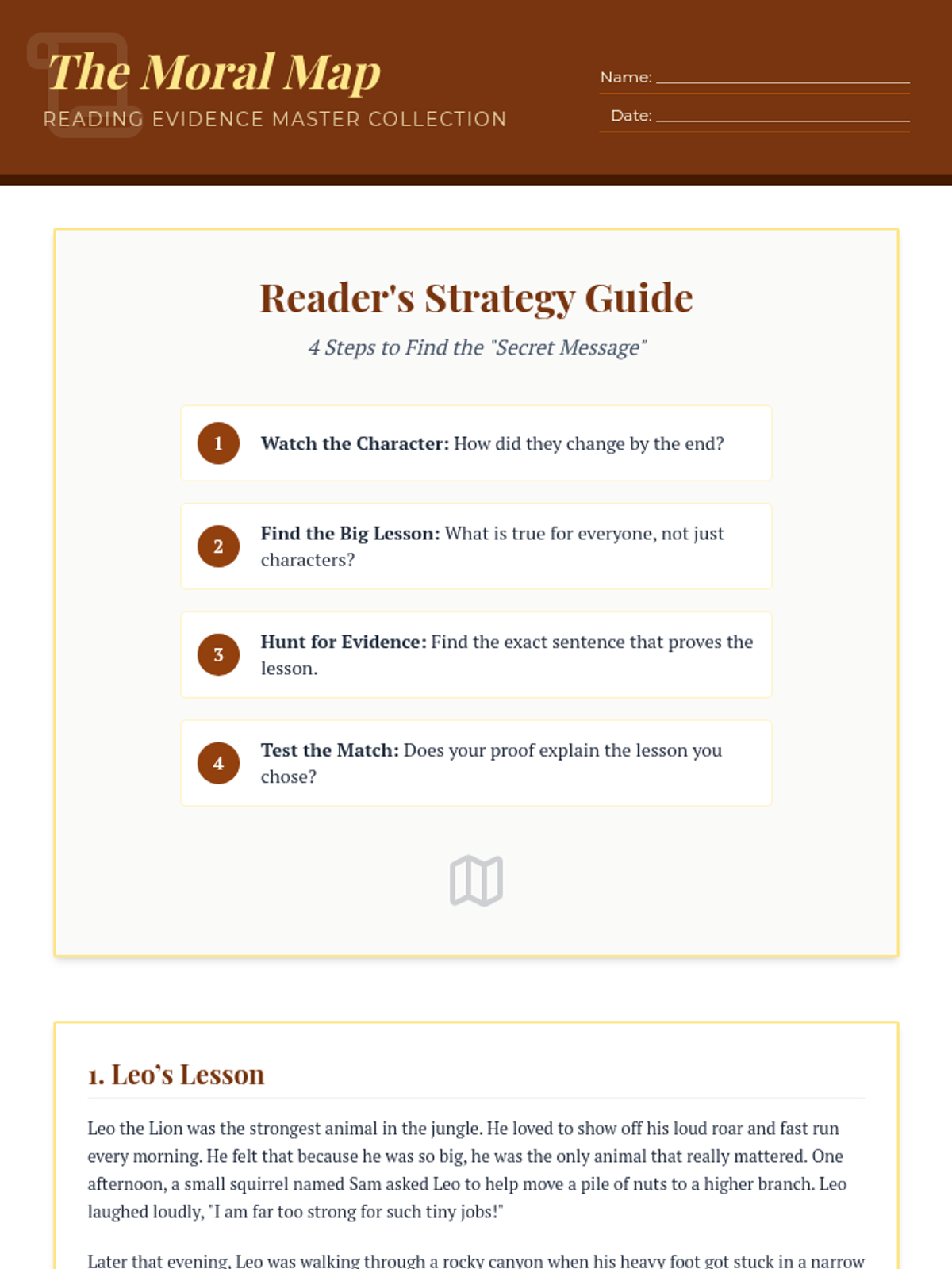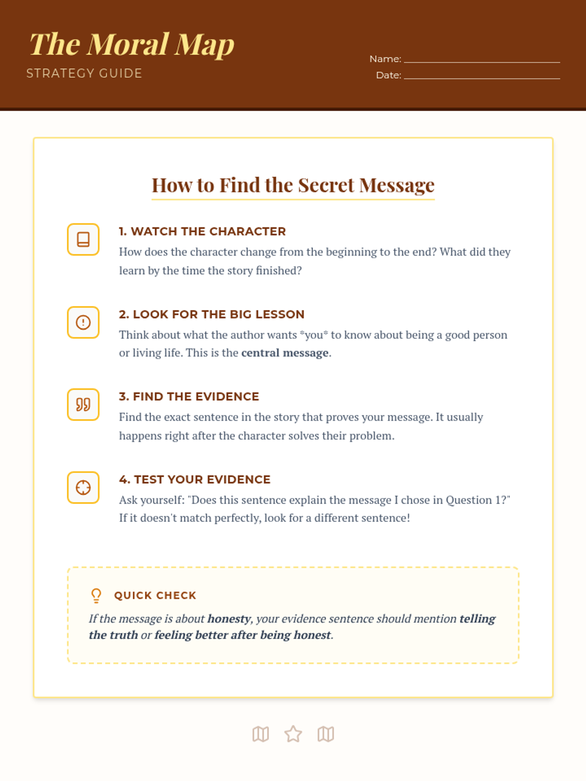 A strategy checklist for 3rd-grade students to help them identify the central message of a story and select supporting text evidence.