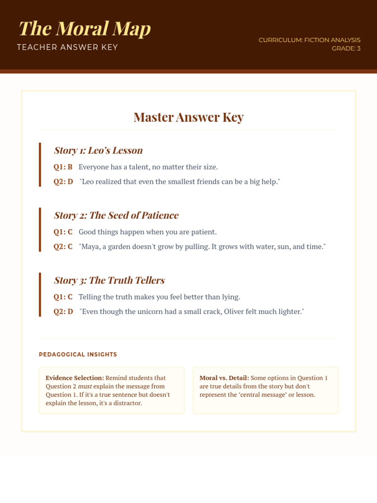 Comprehensive teacher answer key for the expanded 10-passage Master Collection. Updated to reflect 4-choice questions and 3-paragraph story structures. Answer shuffle corrected.