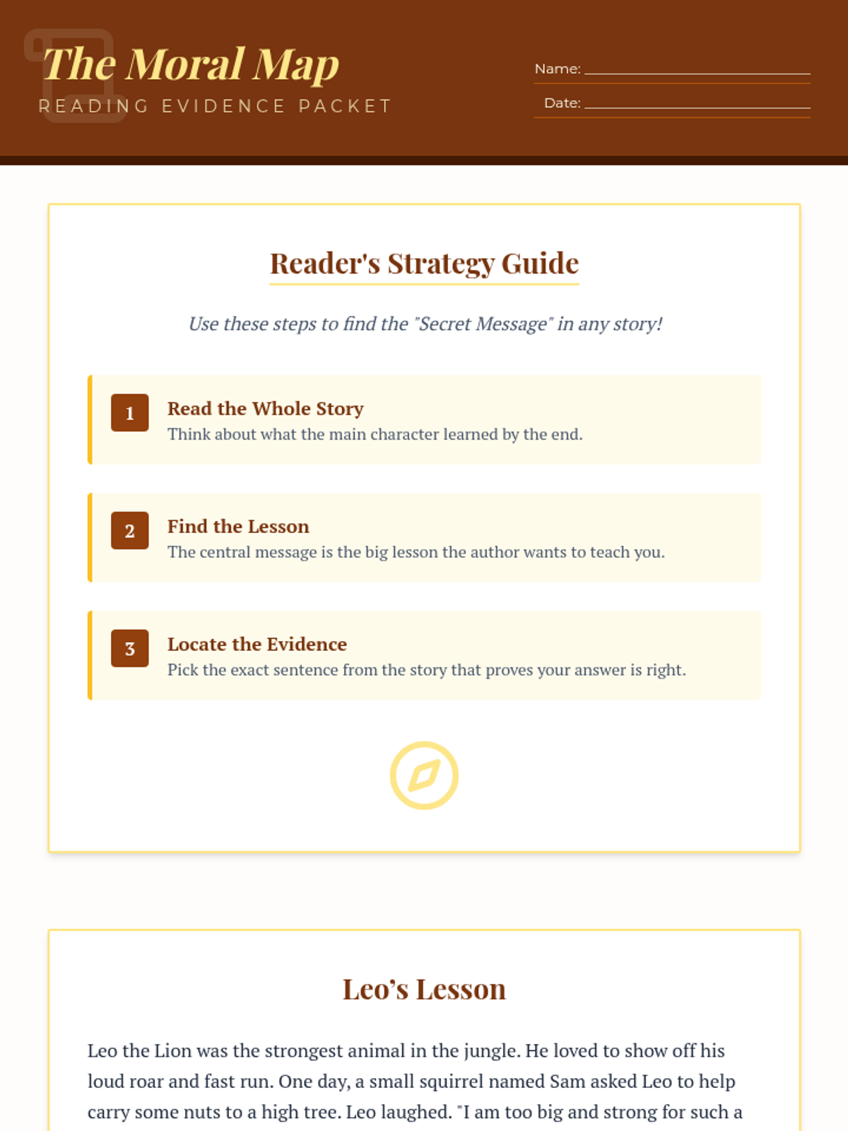 A packet of 3 fiction stories for 3rd grade with a built-in strategy guide. Each story includes two multiple-choice questions focusing on identifying the central message and providing supporting text evidence. Page breaks and content consistency improved.