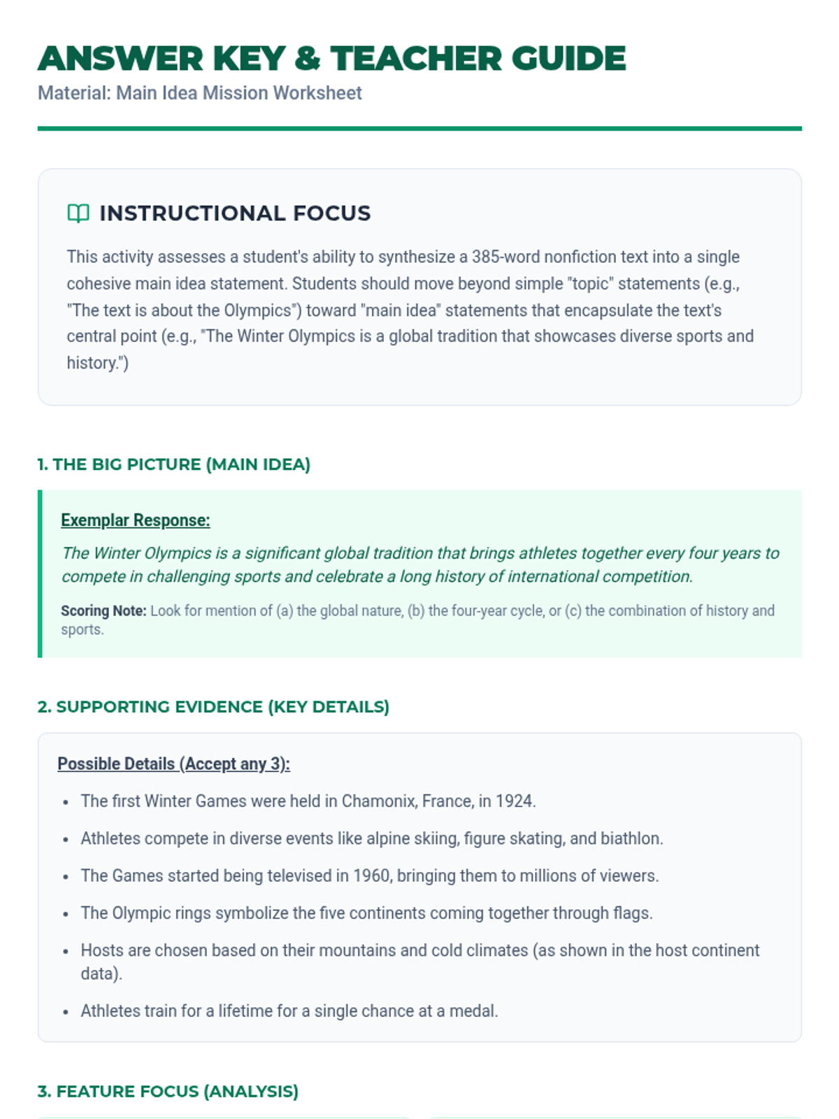 A teacher's answer key and instructional guide for the Main Idea Mission activity, providing exemplar responses, lists of supporting details, and analysis of text features.