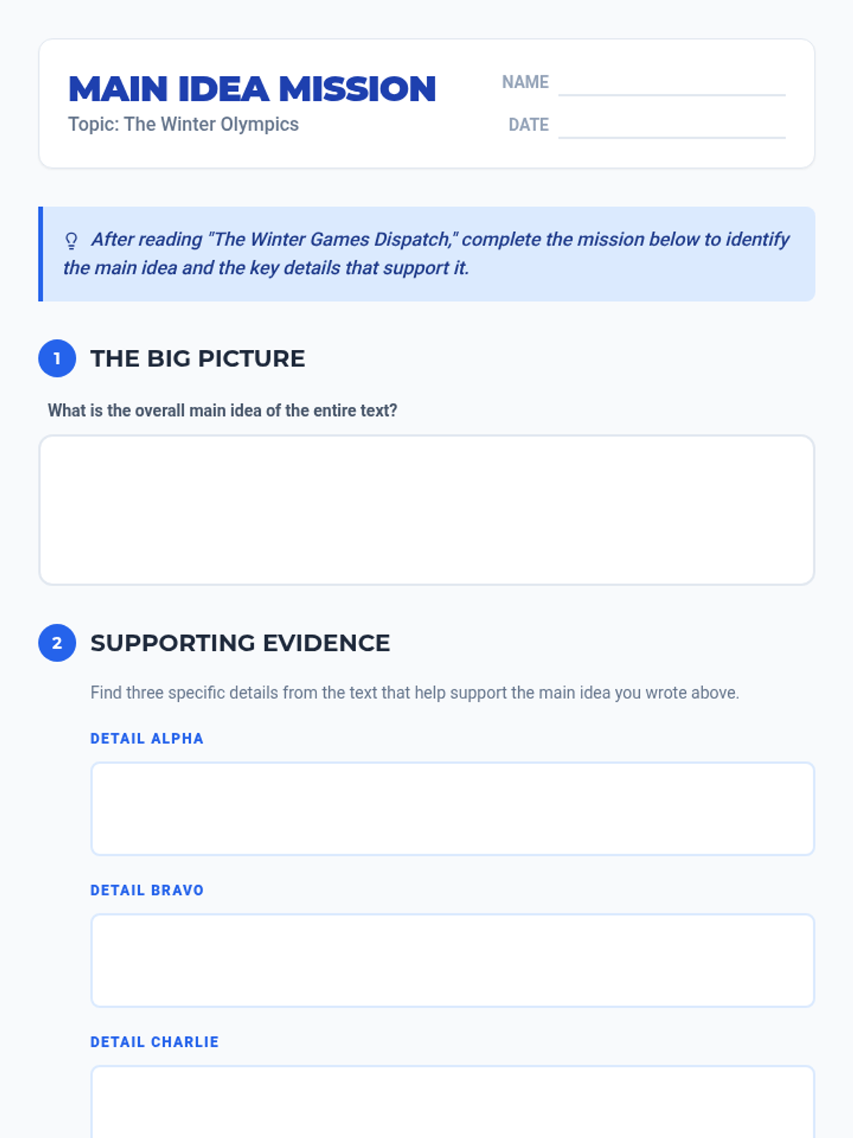 A student worksheet designed to accompany the Winter Olympics text, focusing on identifying the main idea, three supporting details, and analyzing the purpose of text features.