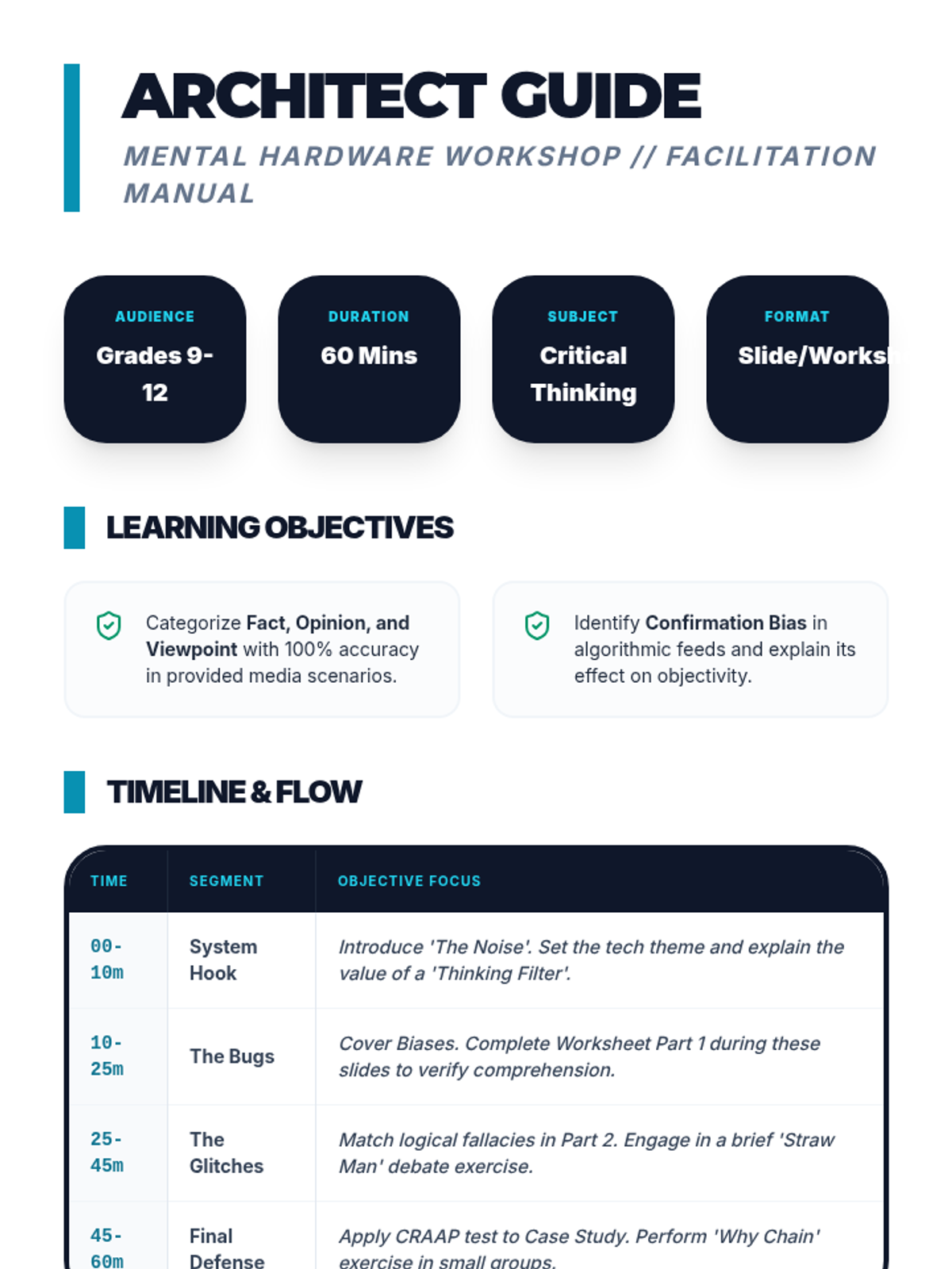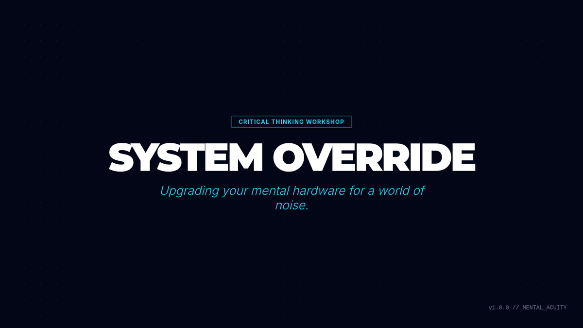 A 15-slide interactive presentation designed for high schoolers on the fundamentals of critical thinking, featuring a modern 'System Override' tech theme. Includes detailed speaker notes for educators.