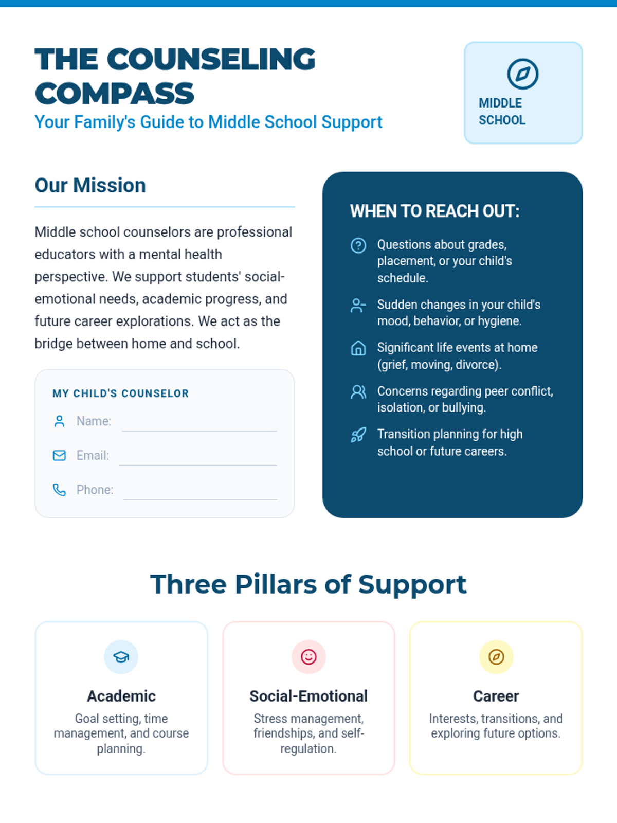 A two-page printable guide for parents to use during the workshop, including contact information placeholders and reflection spaces for their child's needs.