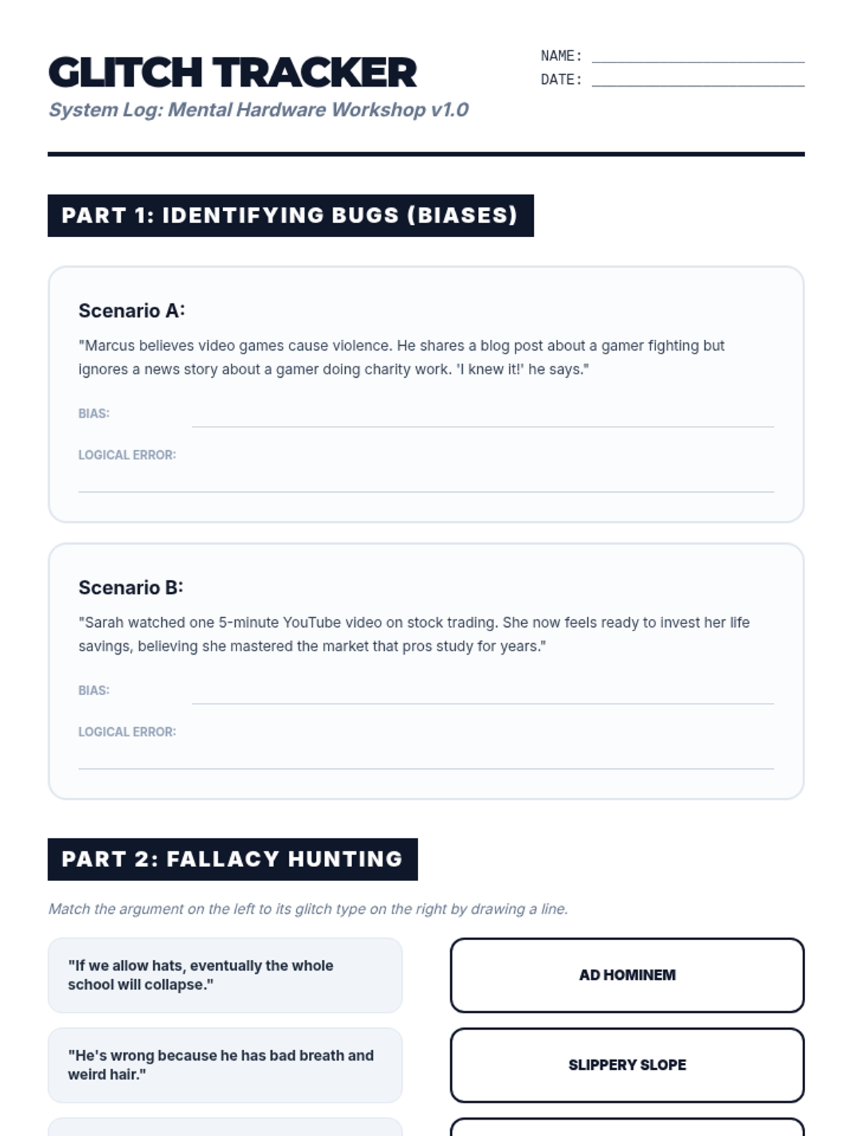 A student-facing worksheet to accompany the 'System Override' presentation, providing exercises in bias identification, logical fallacy matching, and source evaluation using the CRAAP test.