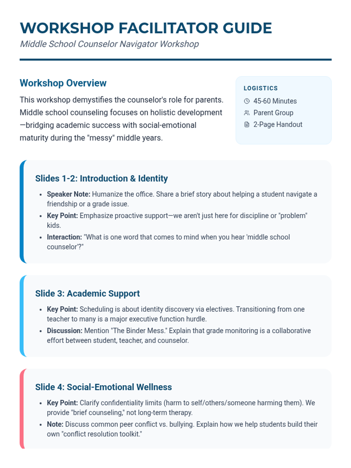 A detailed facilitator guide for the counselor workshop, including talking points, discussion prompts, and an FAQ section to assist with parent engagement.