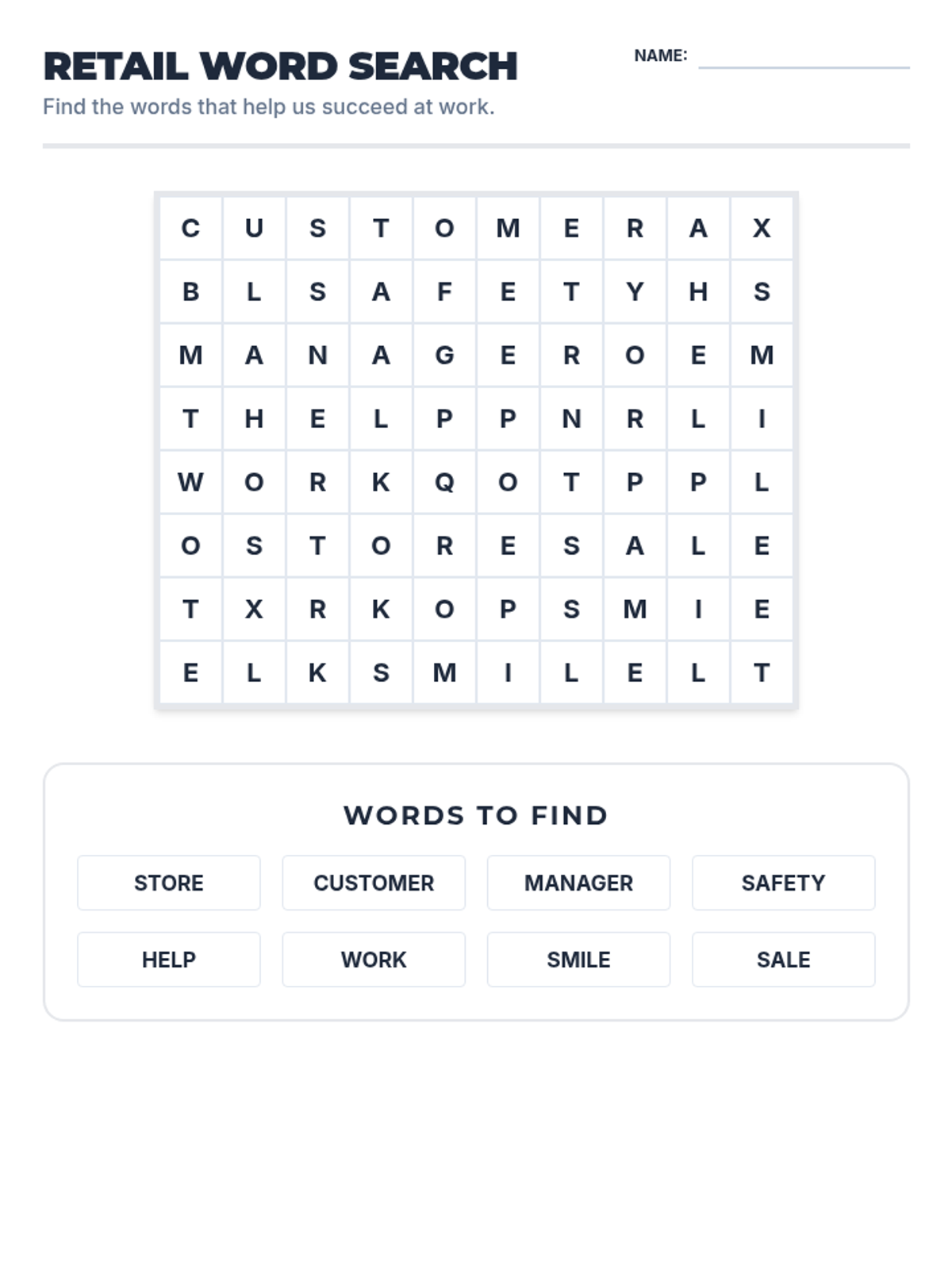 A retail-themed word search worksheet featuring 8 key vocabulary words (Store, Customer, Manager, Safety, Help, Work, Smile, Sale) in a 10x8 grid.