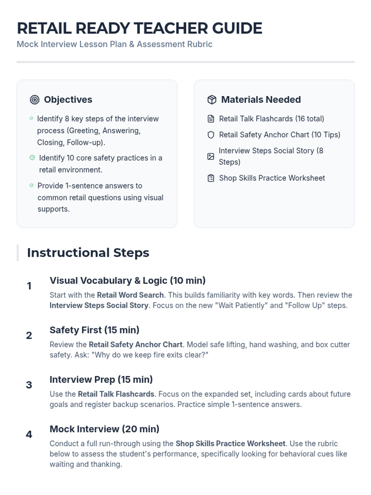 A teacher guide for a retail mock interview lesson, featuring instructional steps, objectives, and a specialized assessment rubric for learners needing visual and verbal supports.