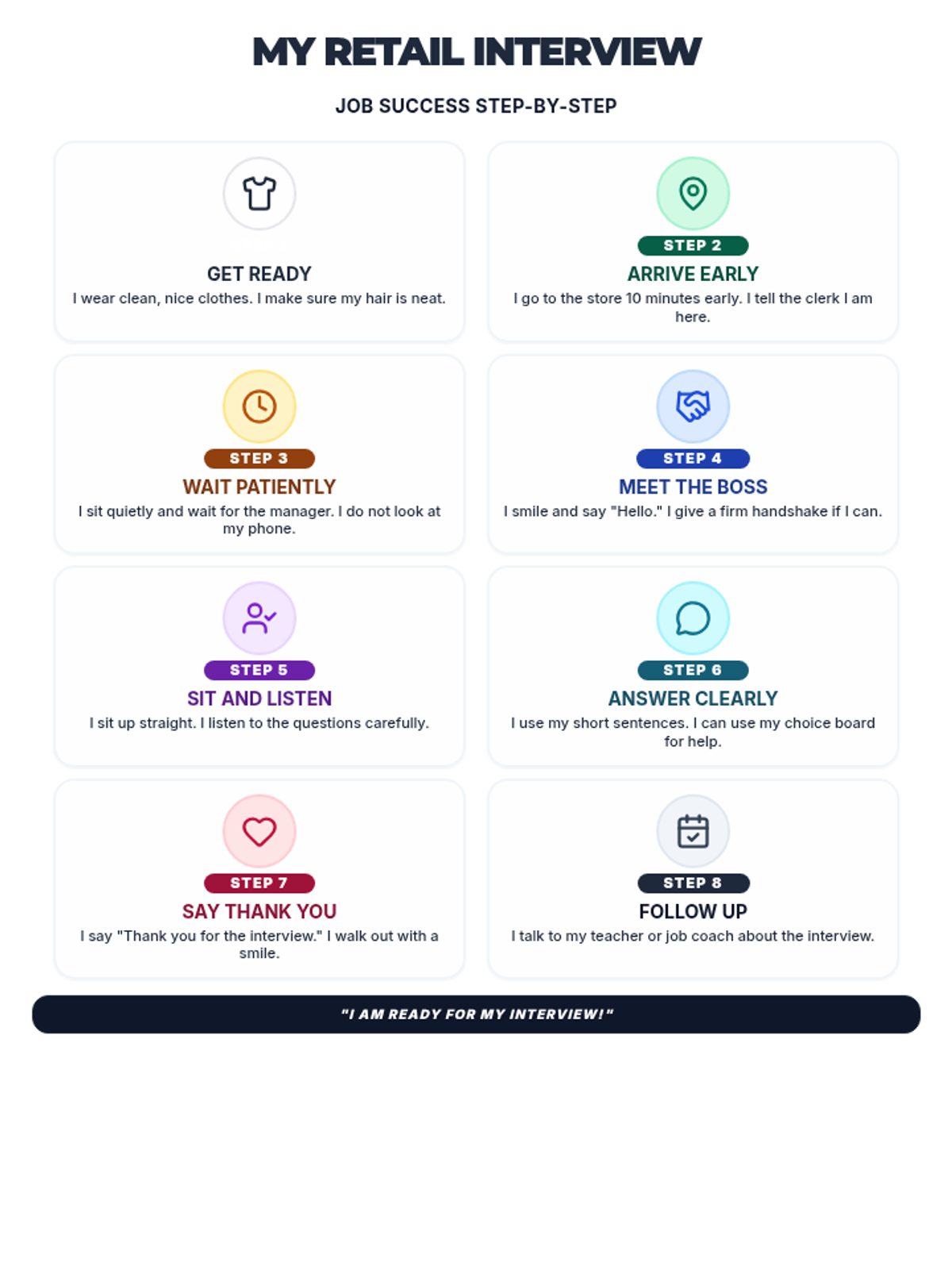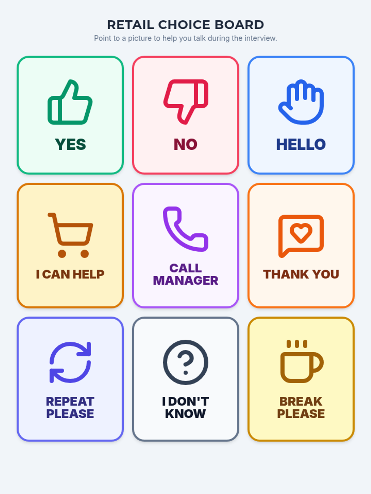 A low-verbal communication choice board for retail interviews, featuring large icons and clear text to assist students in expressing common responses and needs.