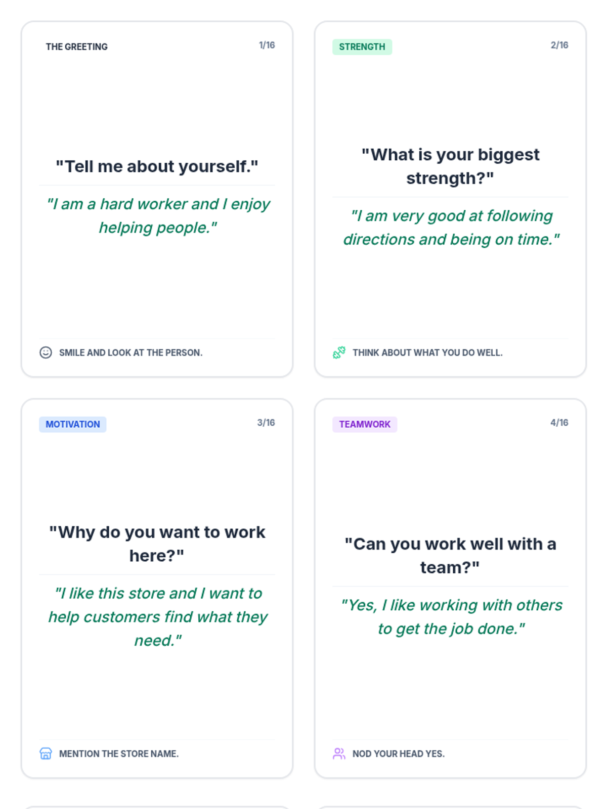 An expanded set of visual interview flashcards for retail positions, now including 16 cards with numbering and improved contrast for learners.