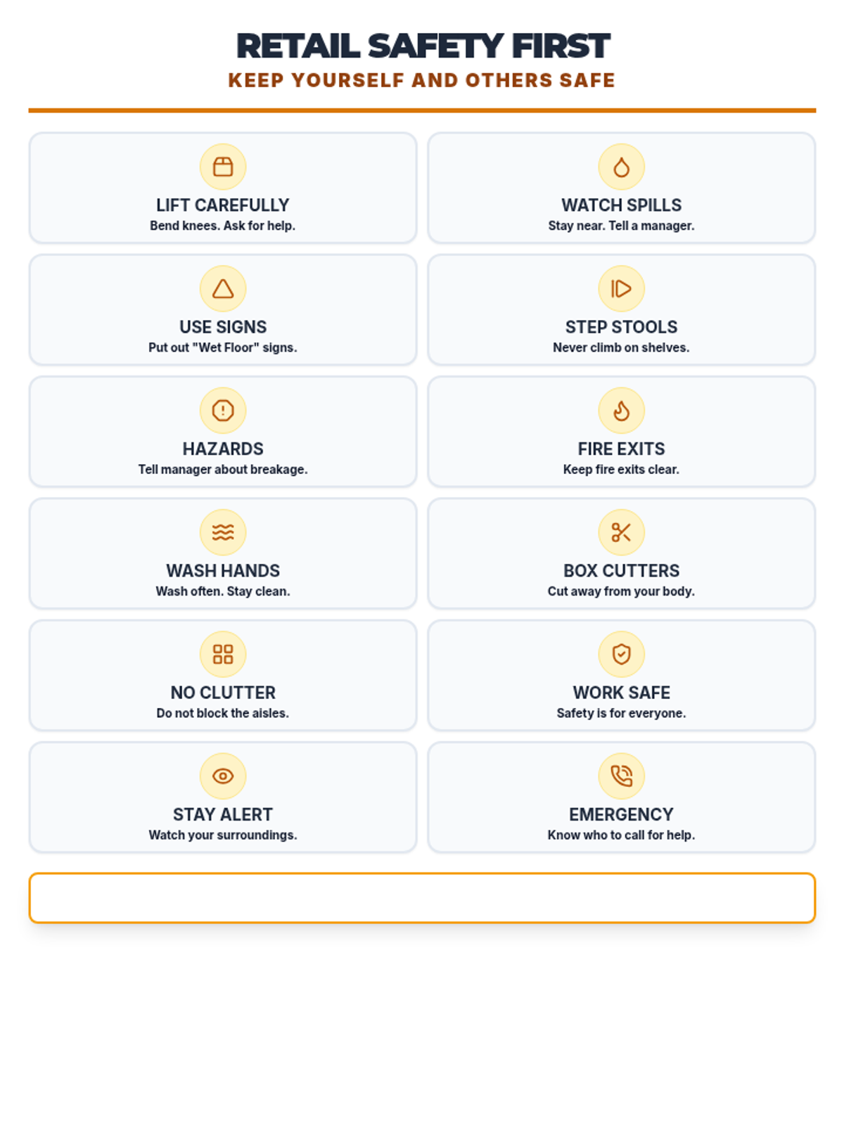 A visual safety anchor chart for retail positions, featuring 12 key safety tips with clear icons and simple language for learners.
