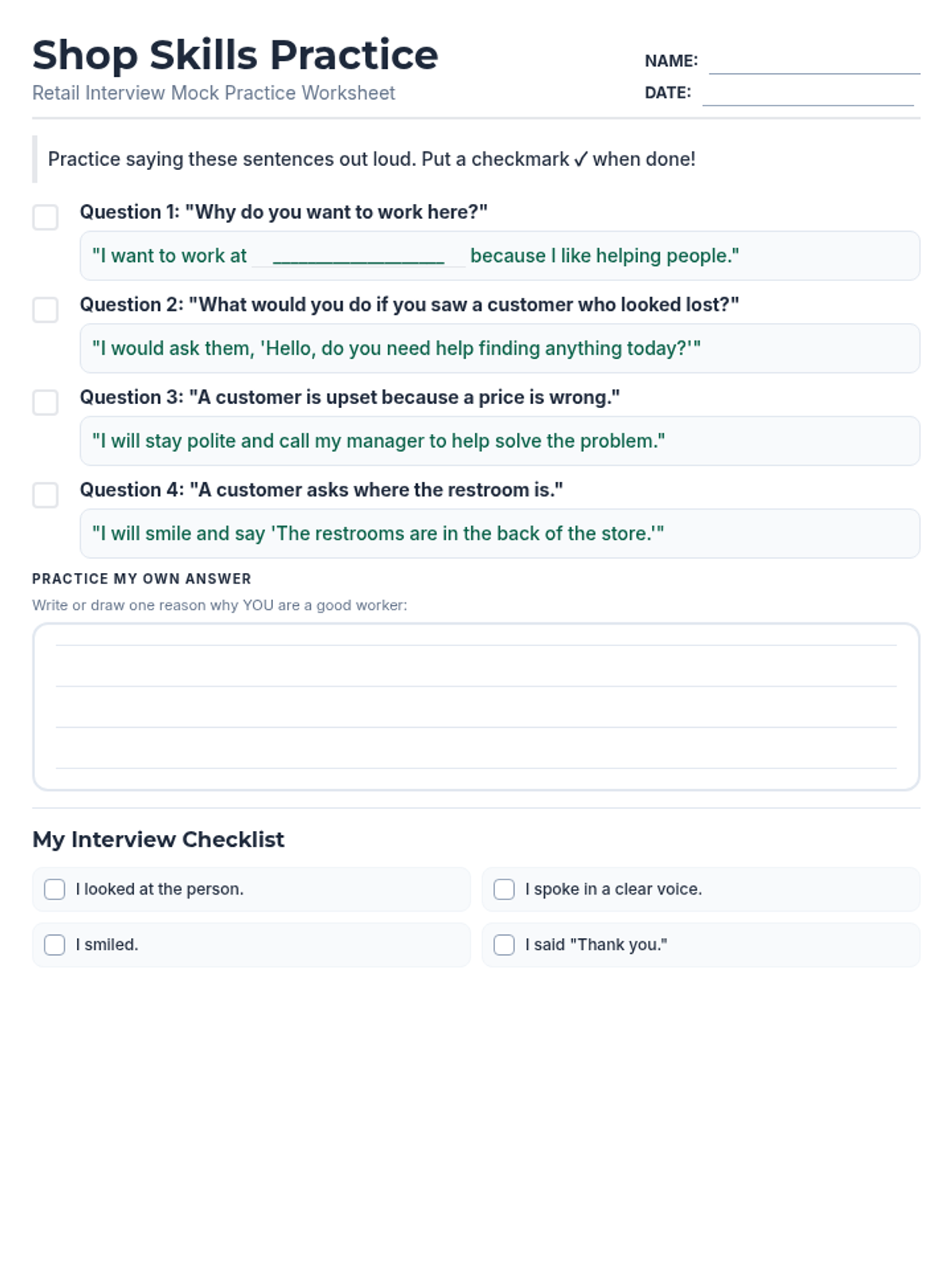 A mock interview worksheet for retail training, featuring guided 1-sentence responses, scenario practice, and a self-reflection checklist for students.