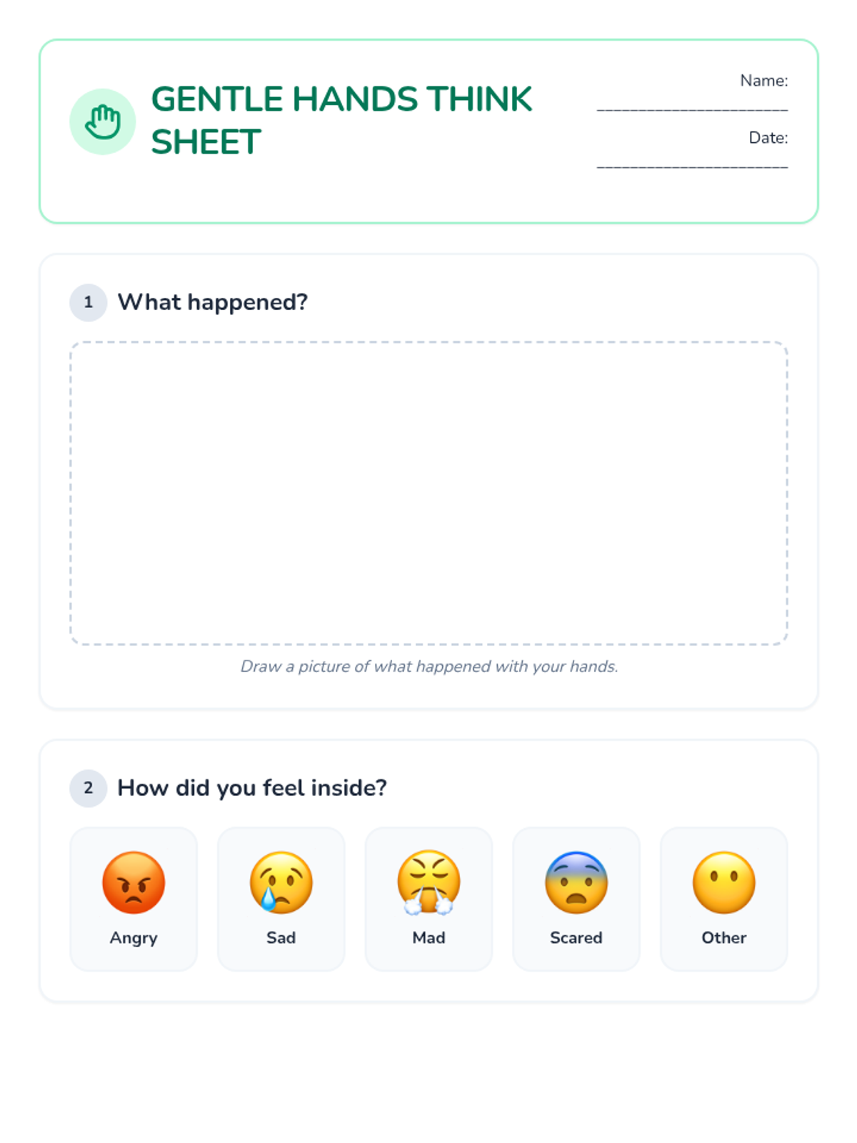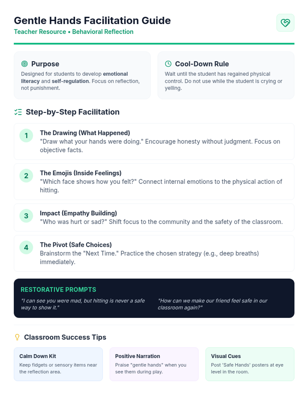A visually engaging reflection worksheet for Kindergarten students to process incidents of physical hitting, featuring an emoji-based emotion check-in and drawing spaces for restorative planning.