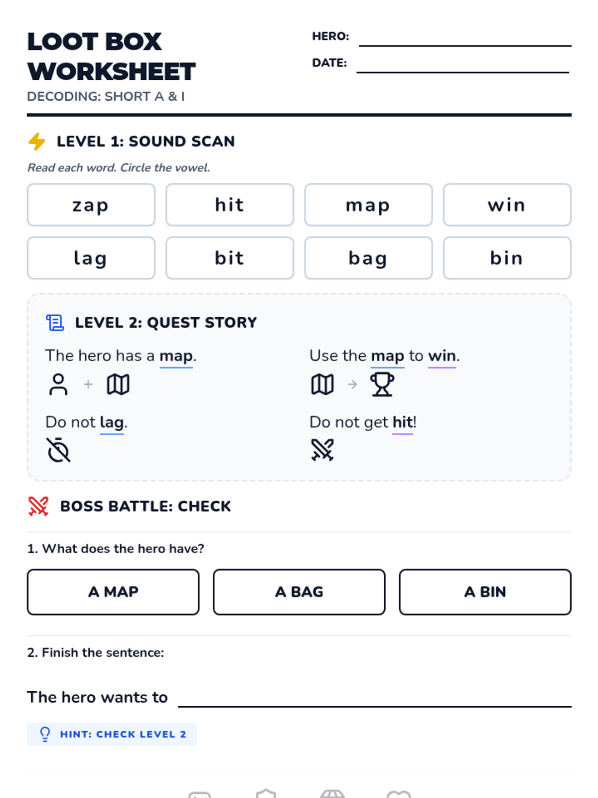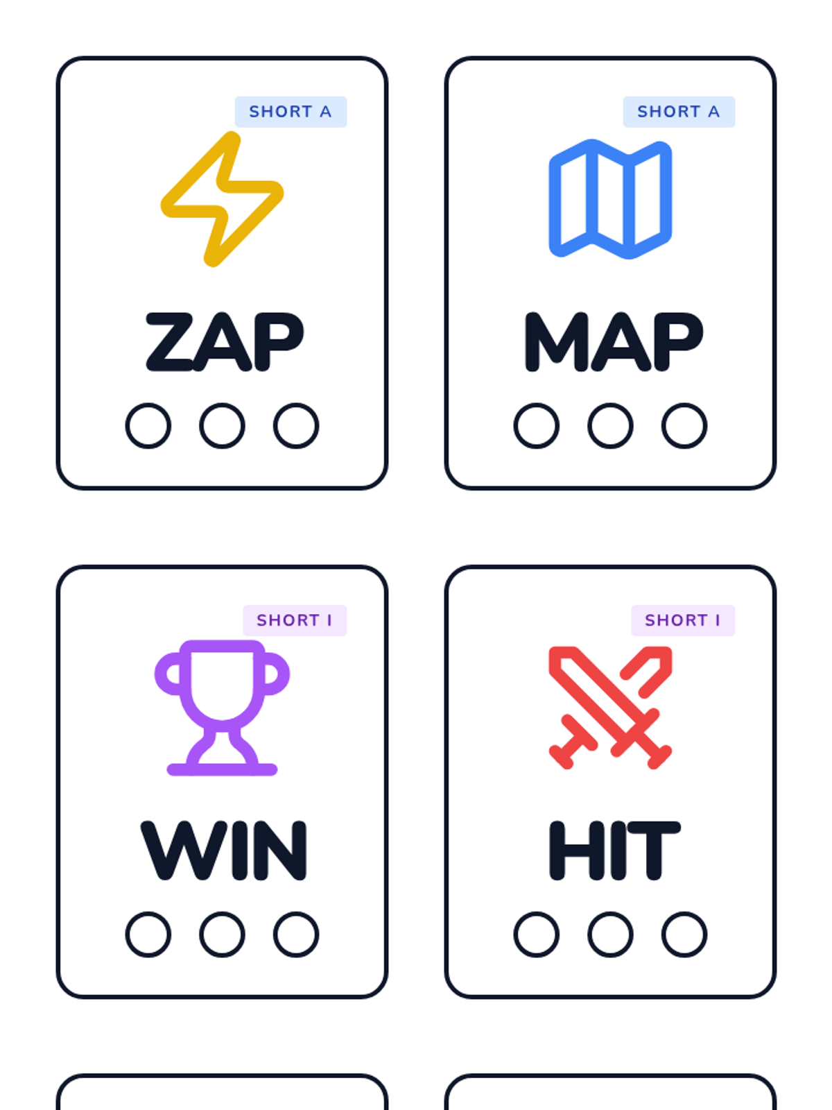Large, symbol-supported flashcards for decoding short 'a' and 'i' words. Revised to use high-contrast gaming-themed vocabulary and icons, and to fix page-break issues.