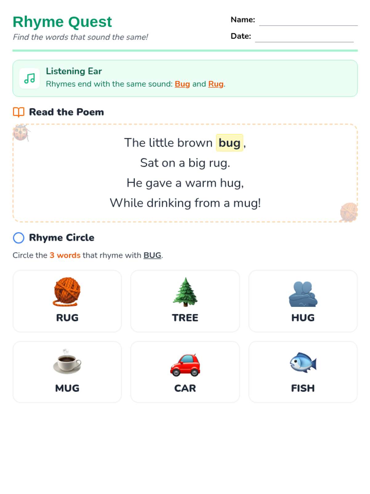 A second student worksheet for identifying rhyming words through a simple poem and visual identification task. Features 'bug' rhymes with high-contrast emerald and orange accents. Optimized for single-page printing.