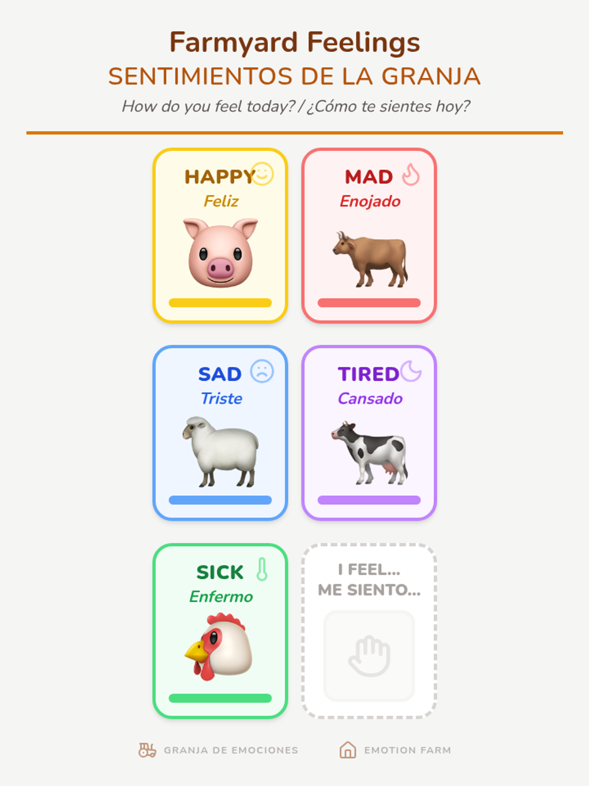 A bilingual (English/Spanish) feelings chart for high-needs students featuring farm animals representing five core emotions: happy, mad, sad, tired, and sick. Includes a "My Feeling" space for non-verbal identification.