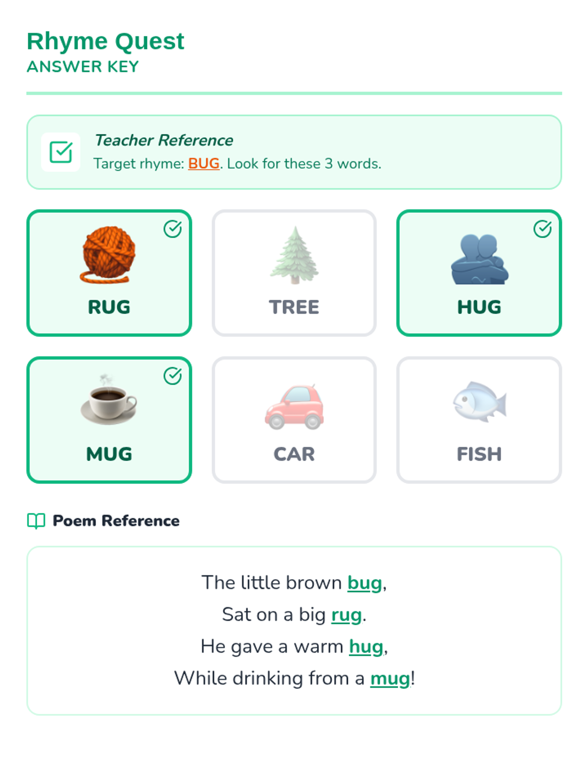 Teacher answer key for the Rhyme Quest Worksheet, clearly identifying the three rhyming words for easy grading. Optimized to fit on a single page.