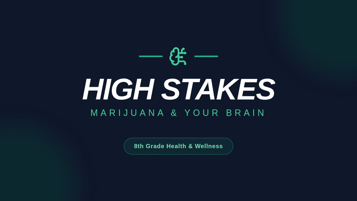 An 8th grade slide presentation exploring the risks and dangers of marijuana use, with a heavy focus on the developing brain, academic impact, and mental health. Revision: Fixed content visibility and layout issues.