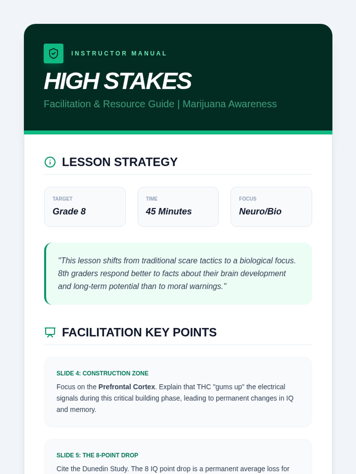 A facilitator guide for teachers delivering the High Stakes marijuana awareness lesson, featuring talking points, study references, and a worksheet answer key. Revision: Improved page layout and contrast.