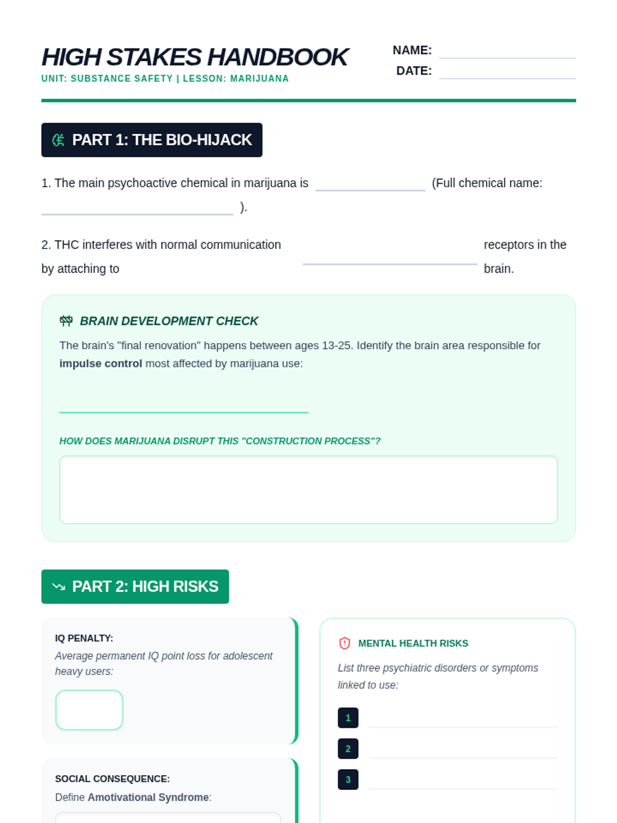An 8th grade worksheet covering the chemical components of marijuana (THC), its impact on the prefrontal cortex, academic risks, mental health dangers, and the specific hazards of edibles. Revision: Consolidated layout and improved work areas.