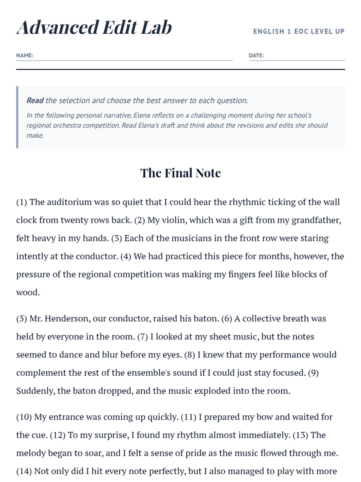 An advanced STAAR-style revising and editing practice featuring a high-stakes personal narrative about an orchestra competition, including more complex grammar and syntax questions.