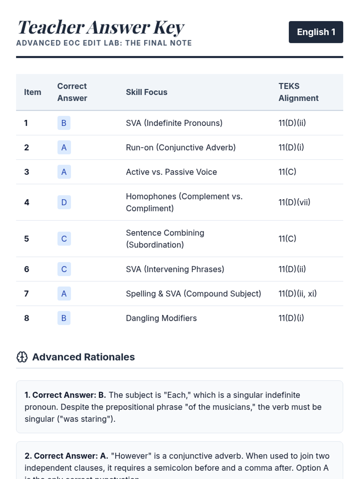 Advanced answer key and rationales for the EOC Edit Lab practice, focusing on sophisticated grammar concepts like dangling modifiers and indefinite pronouns.