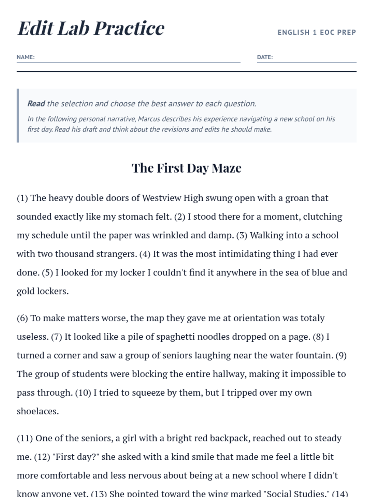 A STAAR-style revising and editing practice document featuring a personal narrative about a student's first day of school, including multiple-choice questions on grammar, mechanics, and style.