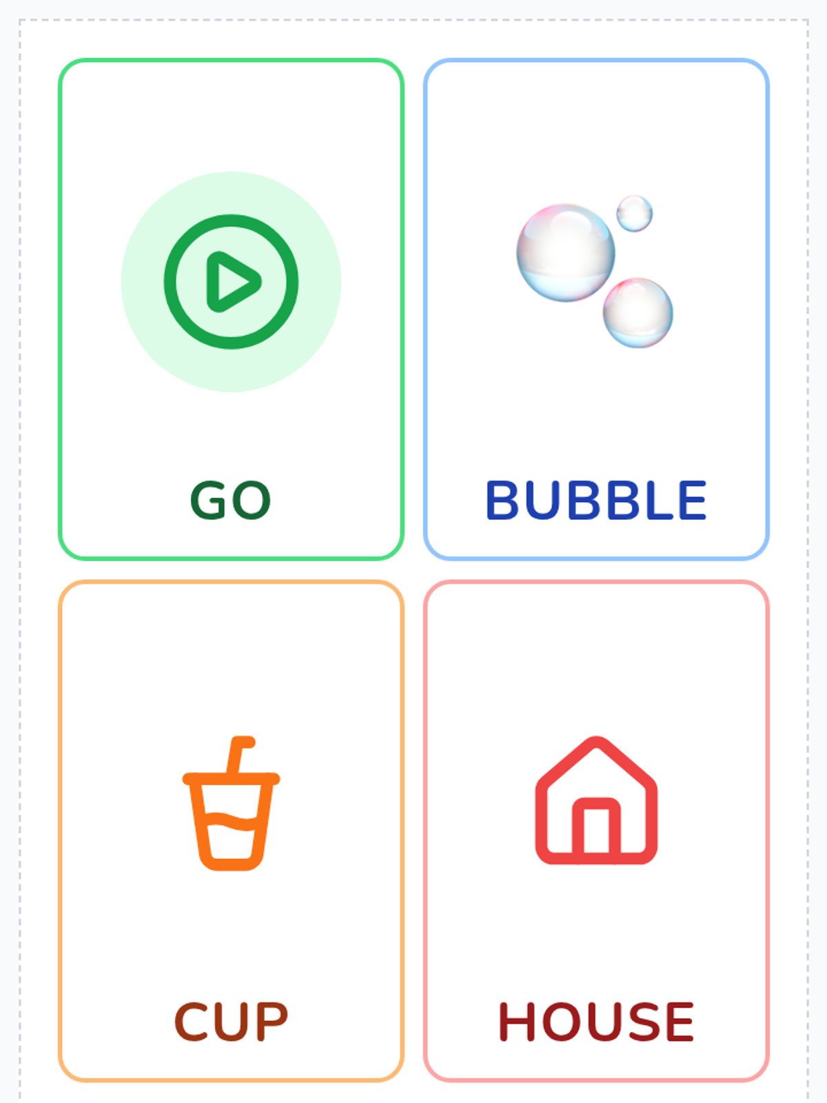 A set of 18 colorful picture flashcards for early vocabulary development. Each card features a clear icon or emoji representing words like 'bubble', 'puppy', and 'push', with bold, uppercase text for easy recognition.