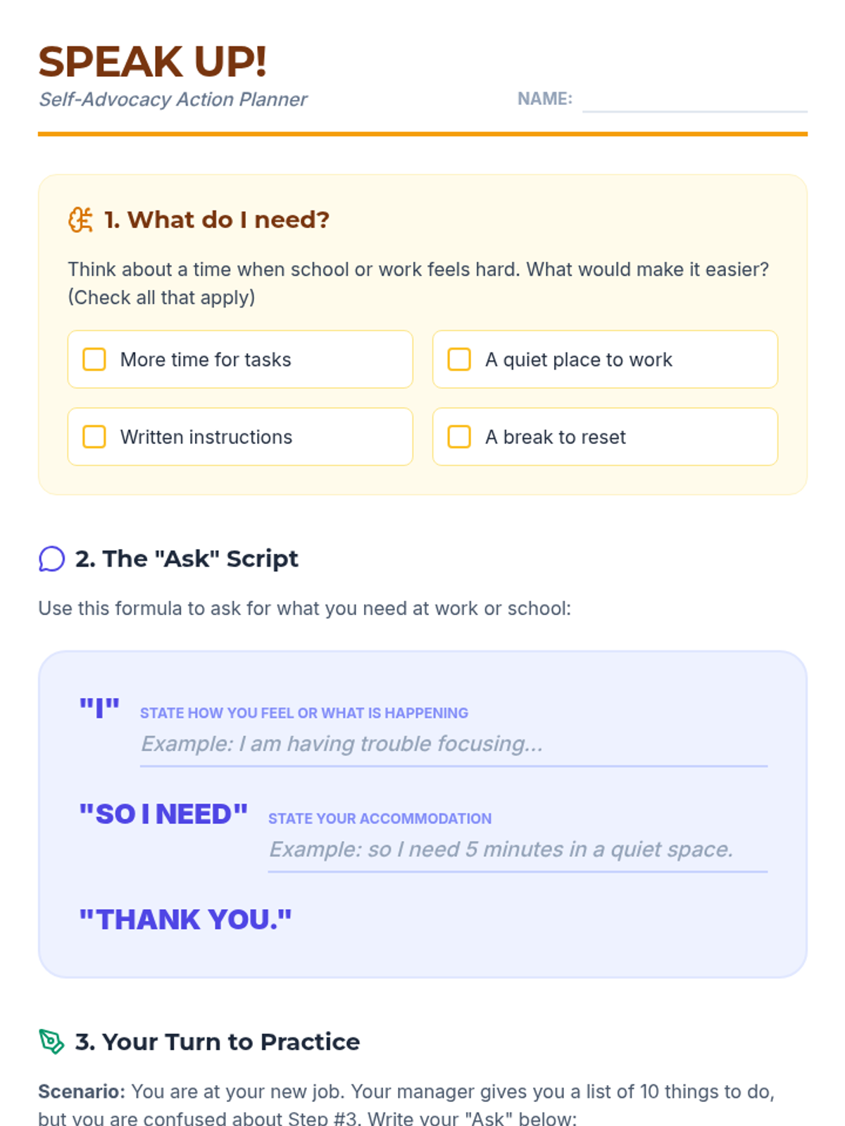 A self-advocacy worksheet that helps students identify their needs and provides a structured script ("I... so I need... thank you") for requesting accommodations in vocational or educational settings.