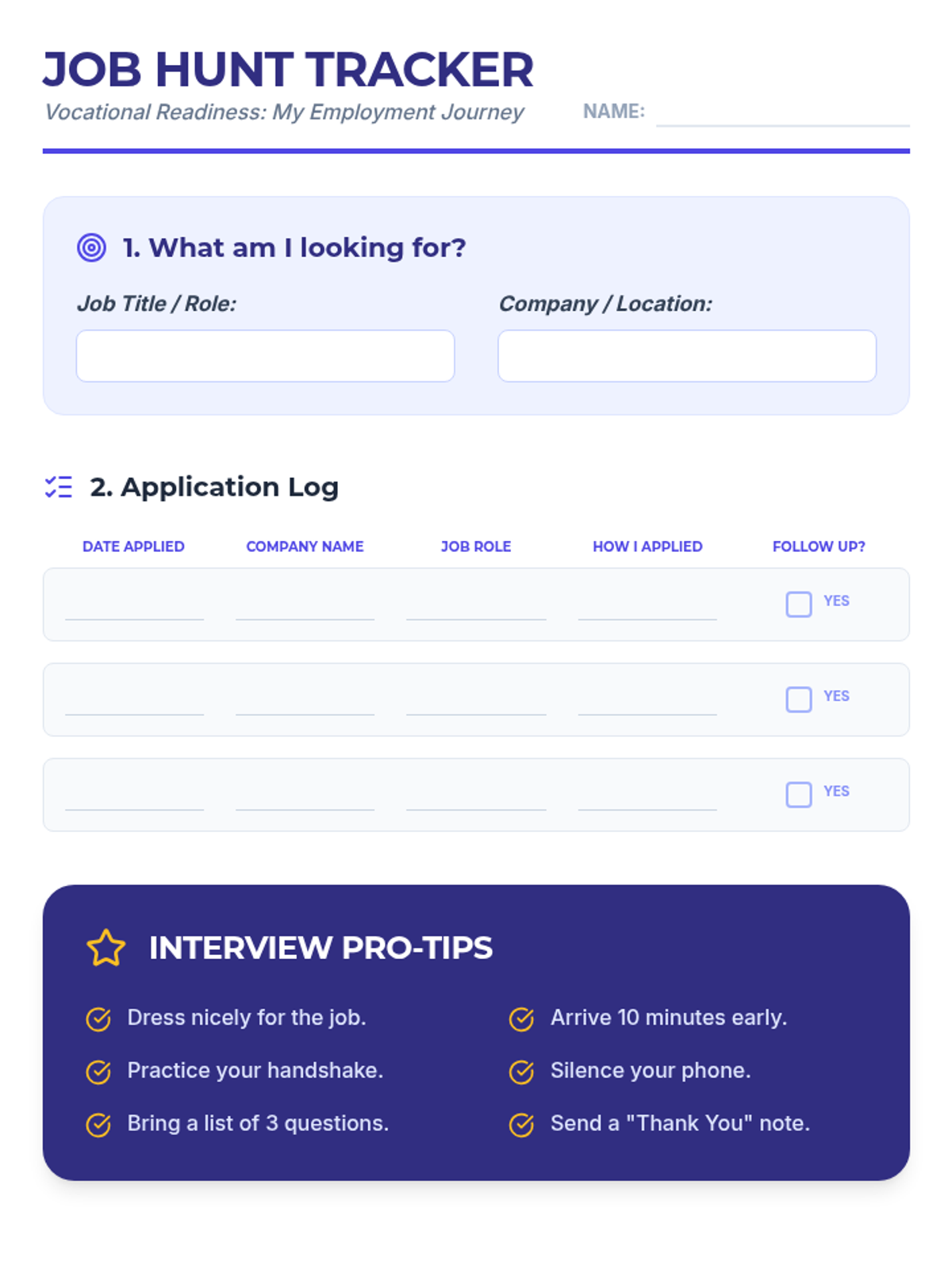 A vocational vocational readiness tool that helps students track their job applications and provides key interview success tips for transition-age youth.