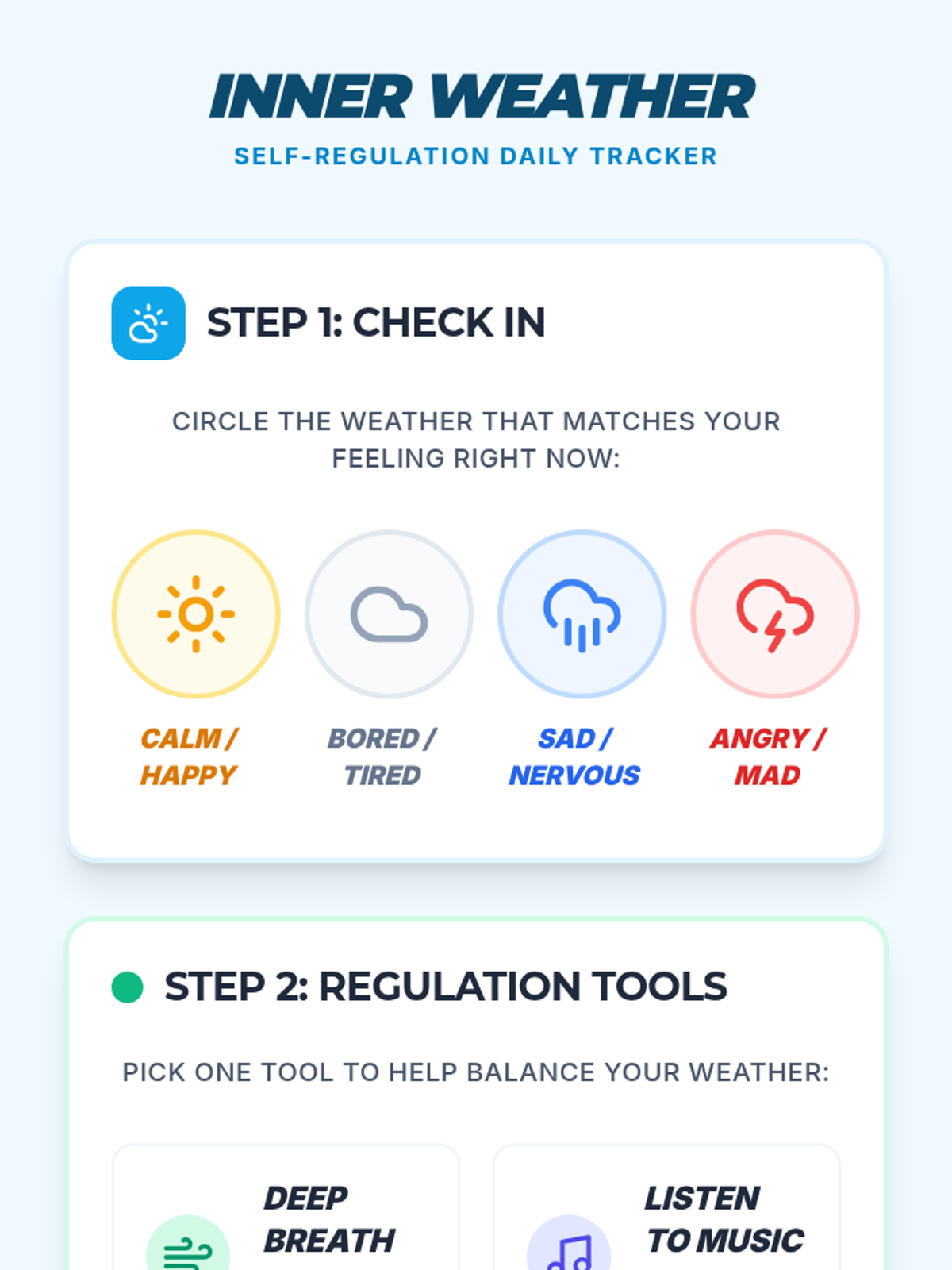 A daily self-regulation tool for students to identify their emotional state ("Inner Weather") and select appropriate regulation strategies from a "Toolkit." Designed with high-interest visual metaphors.