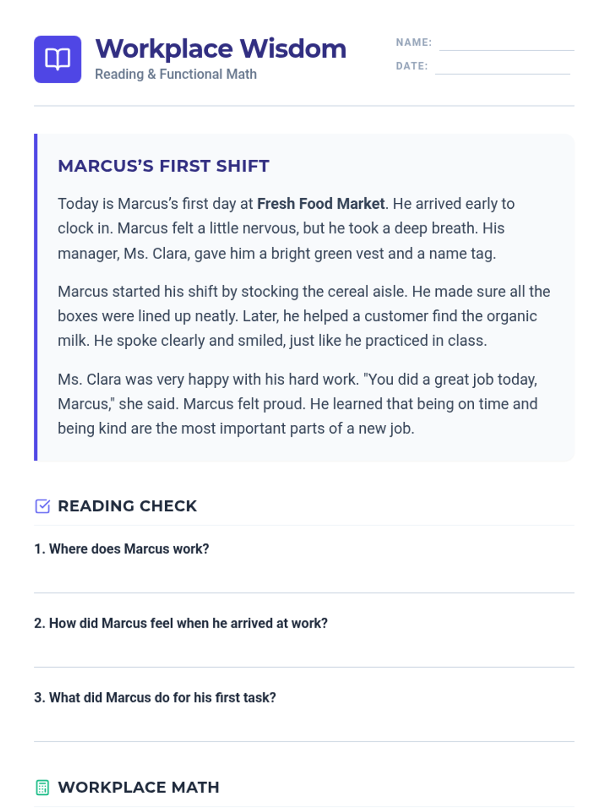 A high-interest, low-level (Hi-Lo) reading passage about a student's first day on the job. Includes reading comprehension questions and functional workplace math problems.