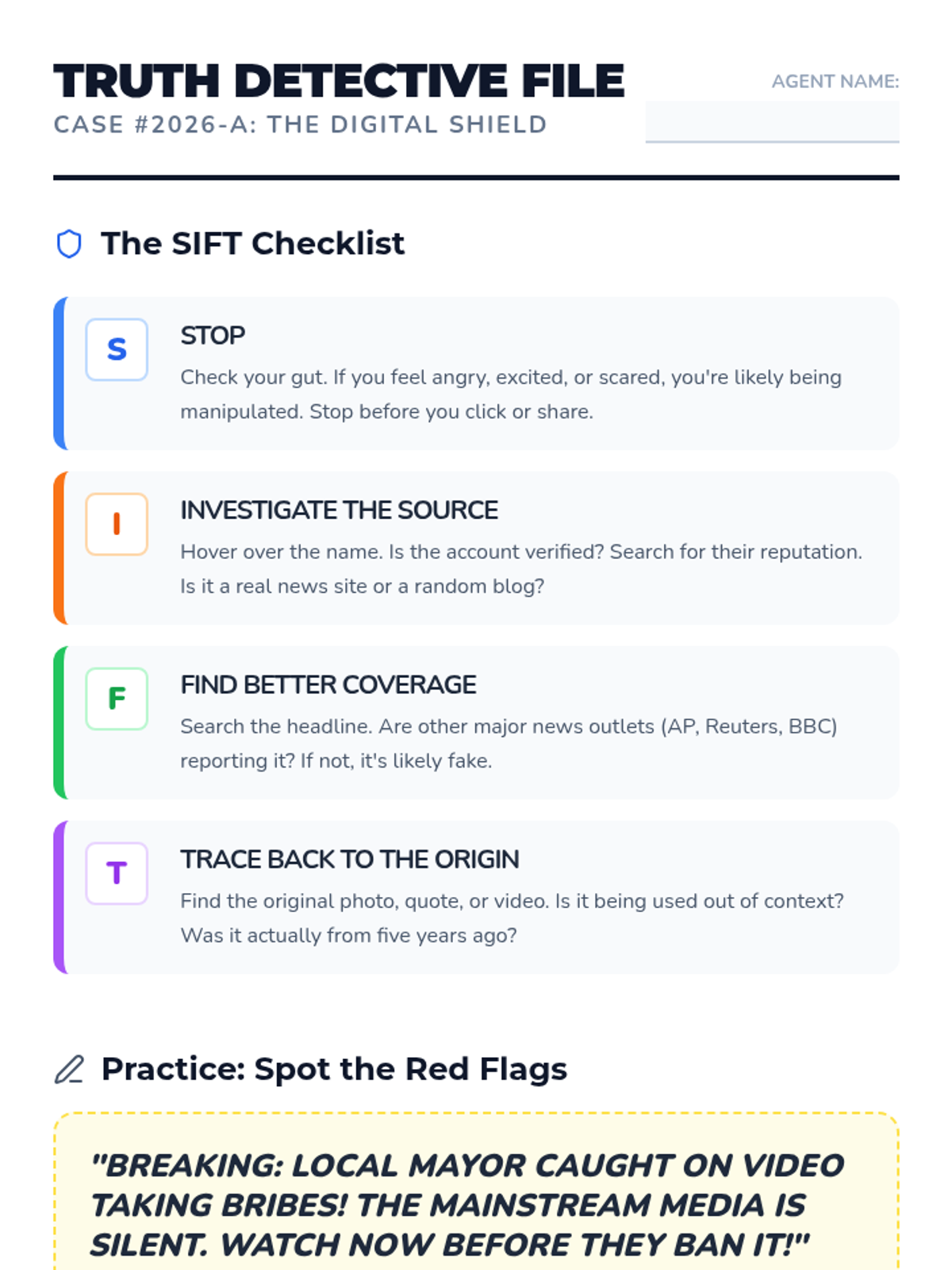 Comprehensive student worksheet featuring a SIFT method checklist, a viral housing scam case study, and a scenario-based 'Is it Real?' quiz.