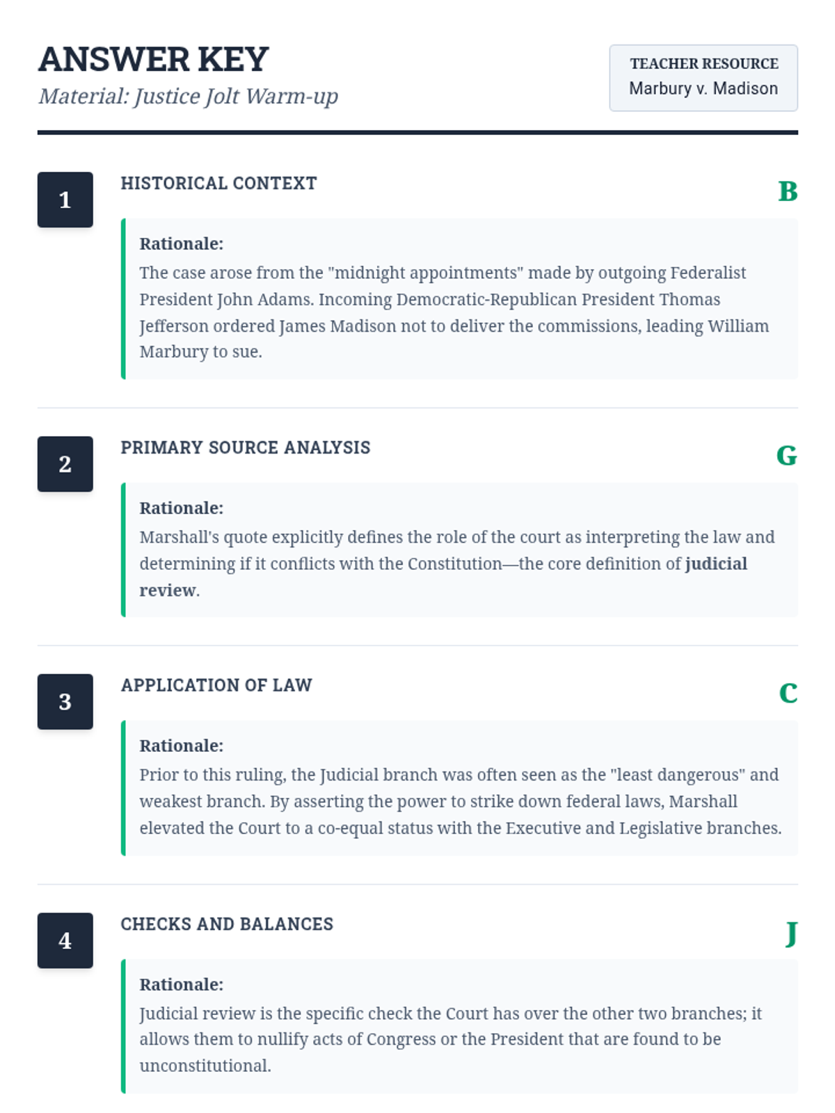 Answer key and grading guide for the Amendment Check Exit Ticket.