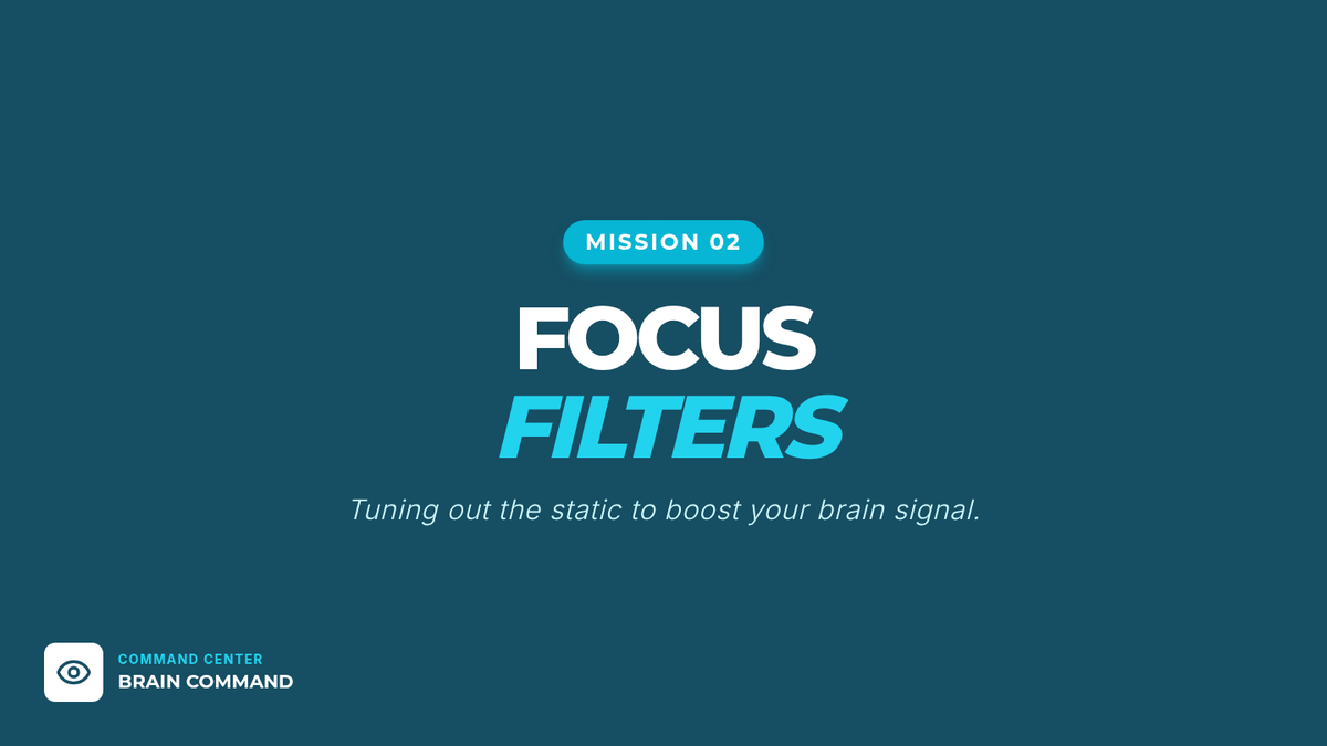 Visual presentation slides for Mission 2: Focus Filters. Explains internal and external distractions and introduces the 3-2-1 Filter strategy.