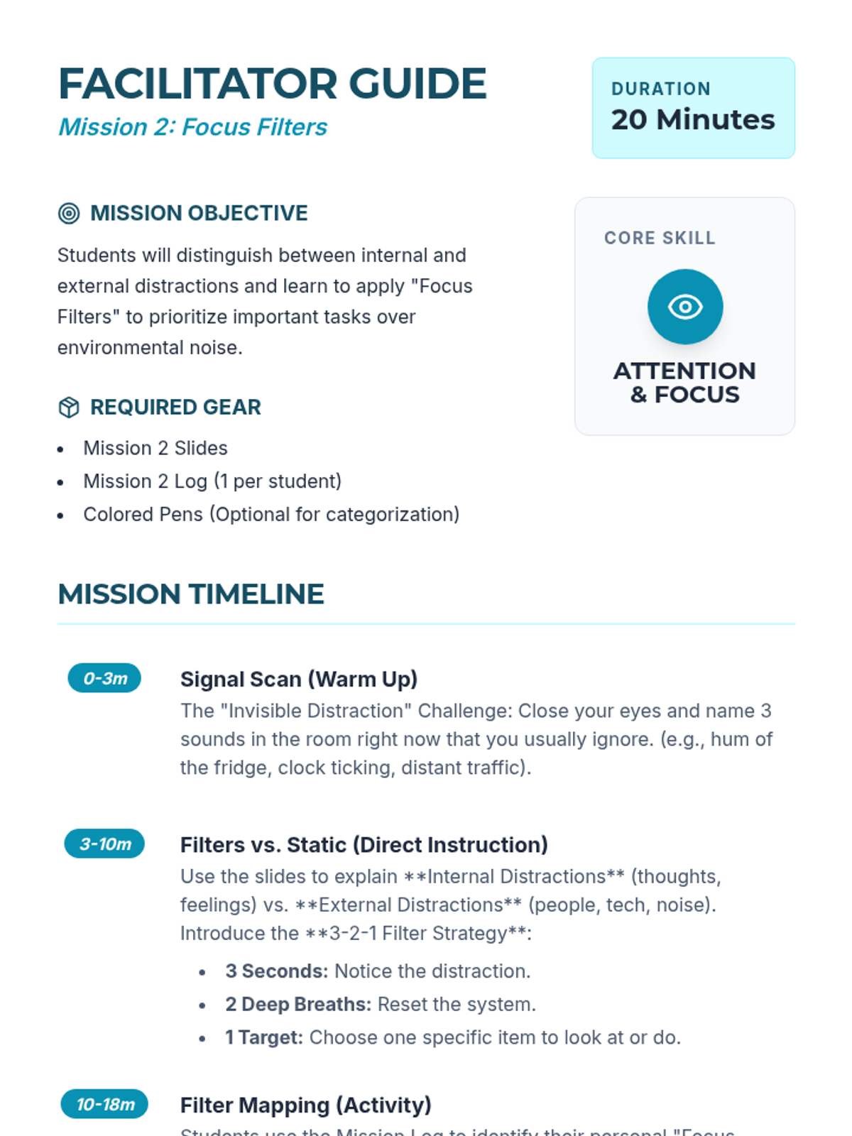A 2-page facilitator guide for Mission 2: Focus Filters. Includes a 20-minute lesson timeline, key focus terminology, and activities for identifying internal and external distractions.