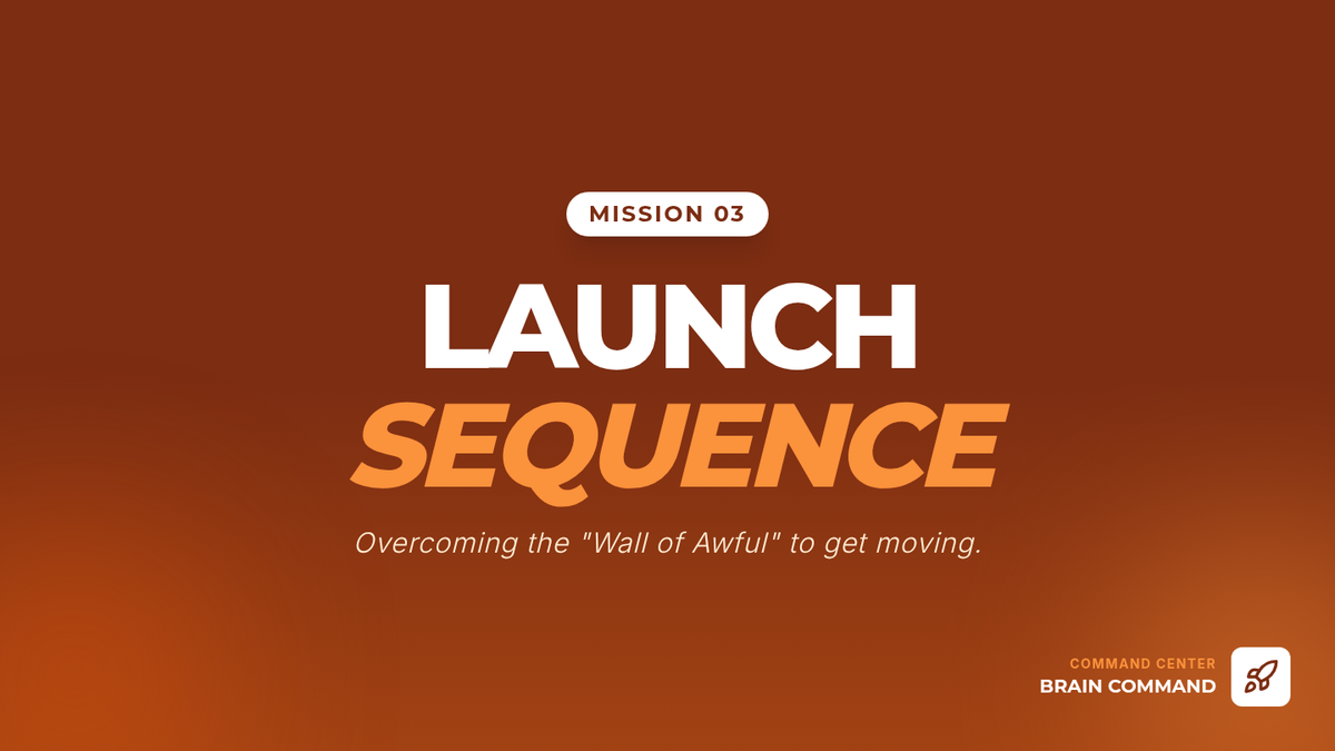 Visual presentation slides for Mission 3: Launch Sequence. Introduces the 5-second countdown and micro-mission strategies for overcoming procrastination.