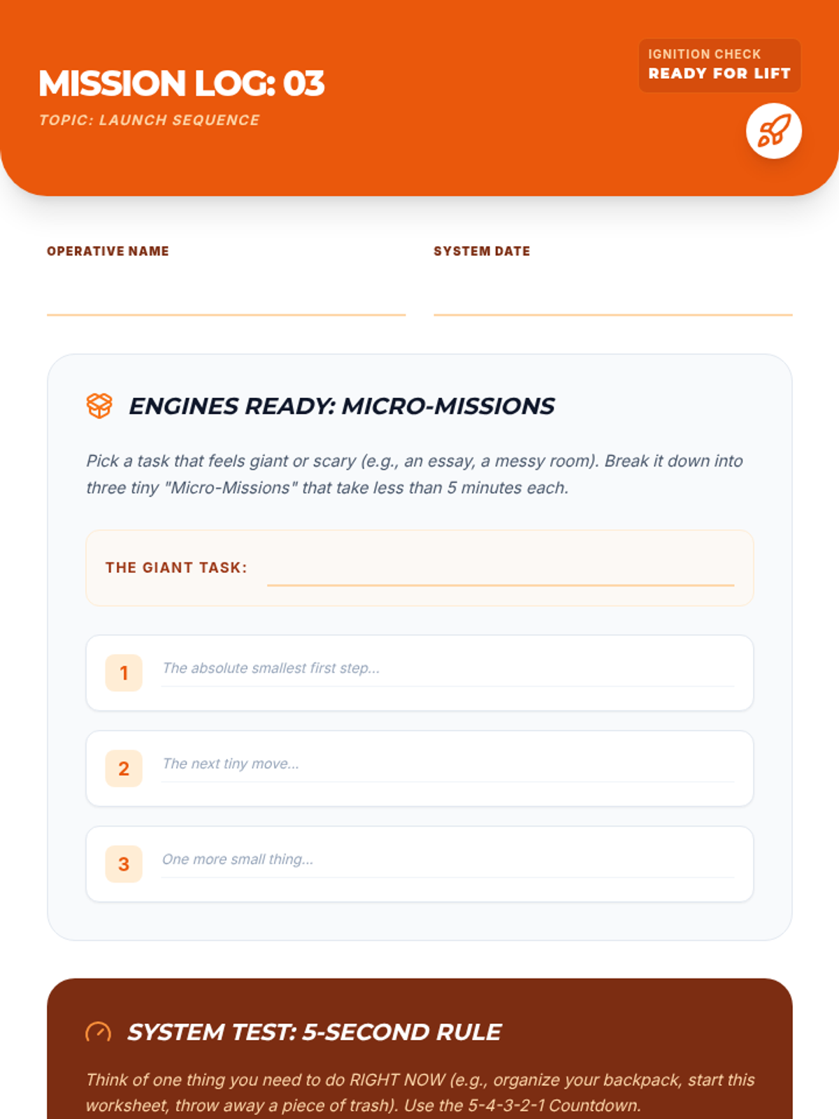 A student mission log worksheet for Mission 3: Launch Sequence. Includes a Micro-Mission planning tool and a 5-Second Rule practice tracker.