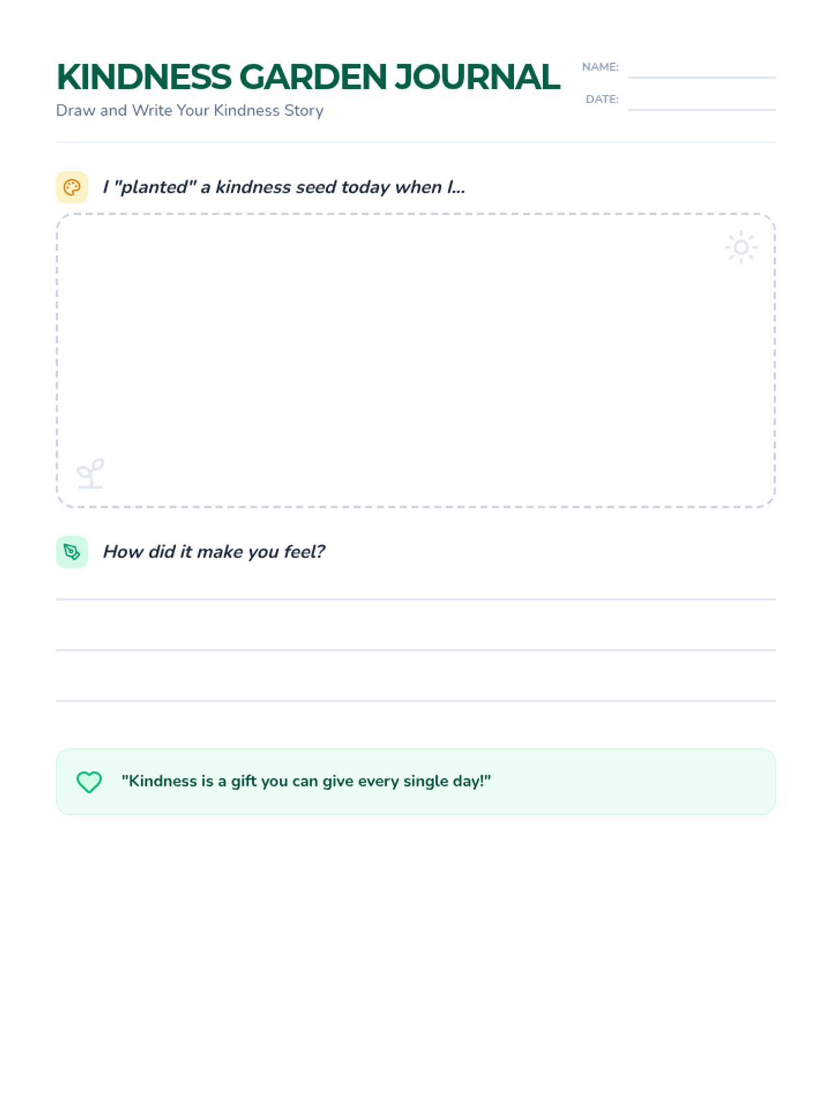 A simple, one-page worksheet where students can draw and write about an act of kindness they performed or witnessed. Revised to fit on one page and optimized for 2nd-grade use.