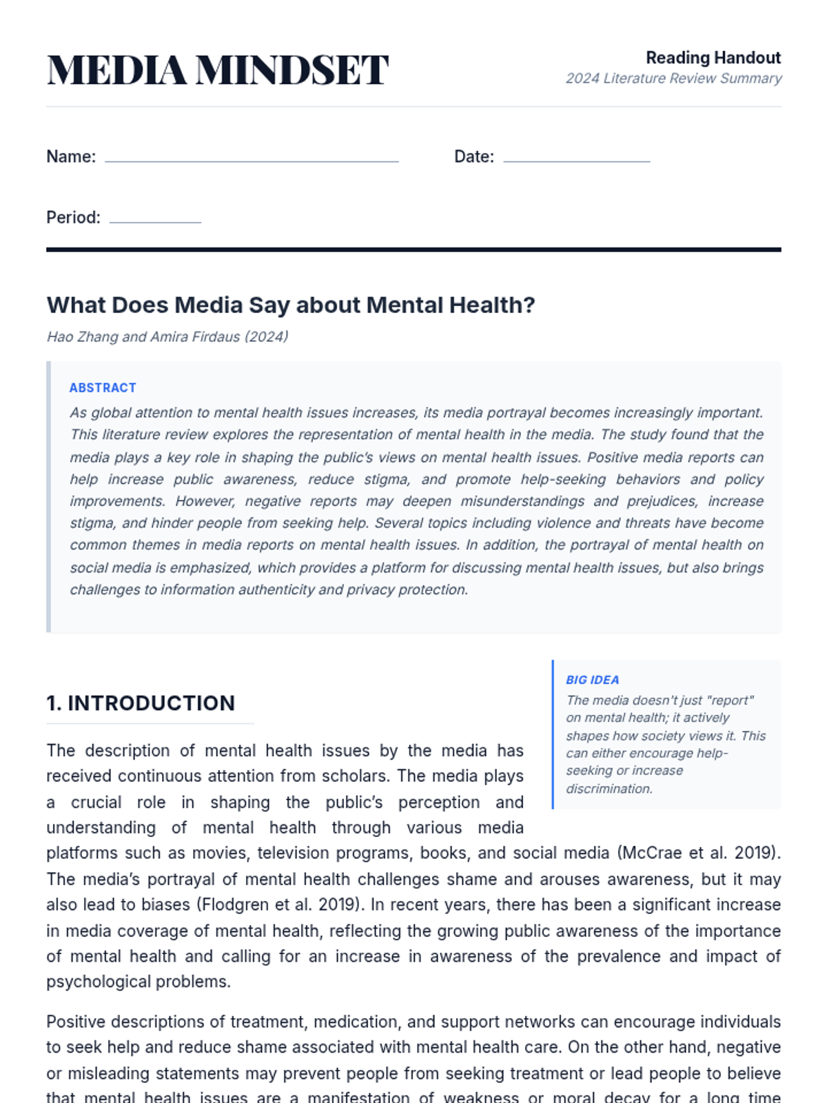 A comprehensive reading handout for high school students based on a 2024 literature review of media coverage on mental health. It features the full original text with a robust float-based layout for margin notes, vocabulary sidebars, and a final assessment page with MCQ and short-answer questions.