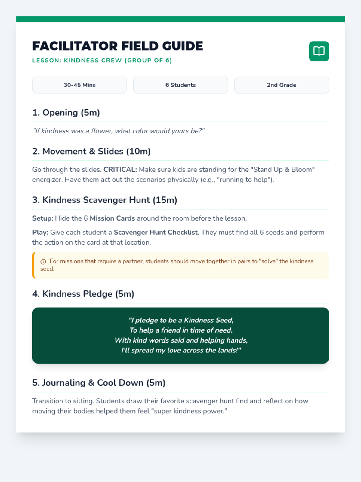 A facilitator's guide providing a step-by-step lesson plan for a small group of 6 students. Revised to fit on one page and includes the Kindness Pledge.