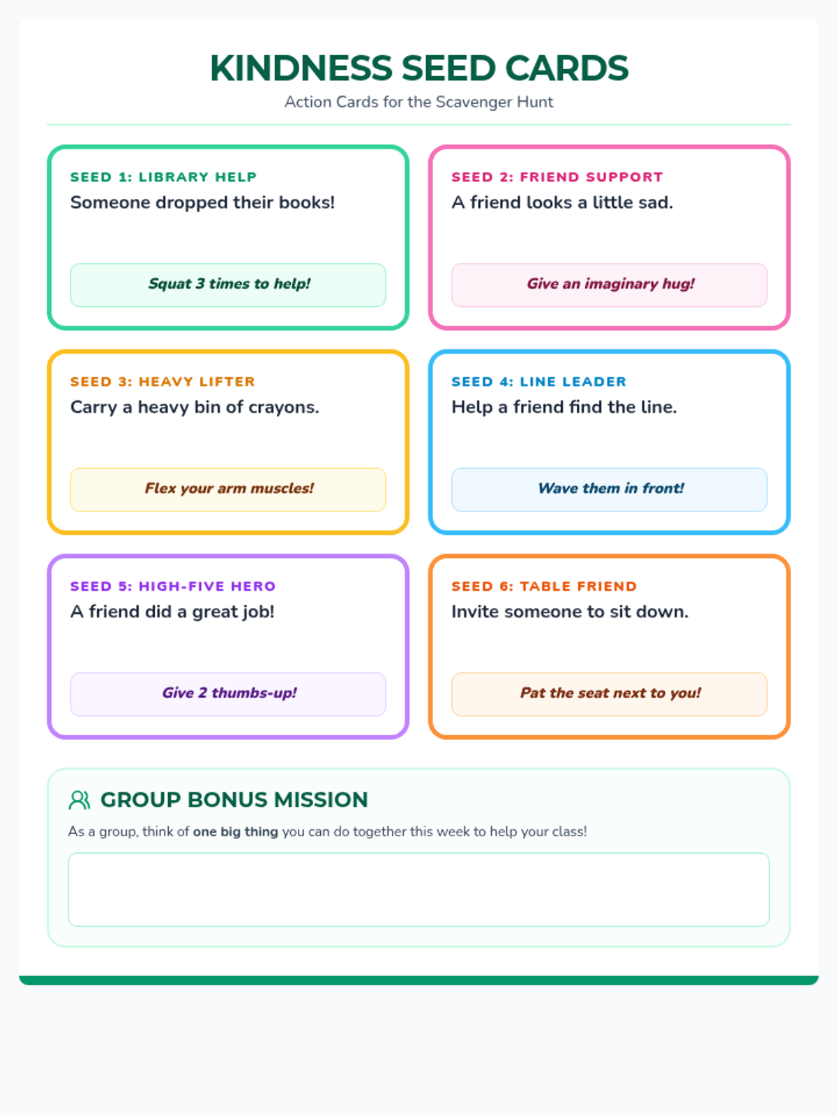 A set of 6 printable mission cards for students to pick and act out or discuss, plus a group bonus mission to promote teamwork. Revised to fit on one page.