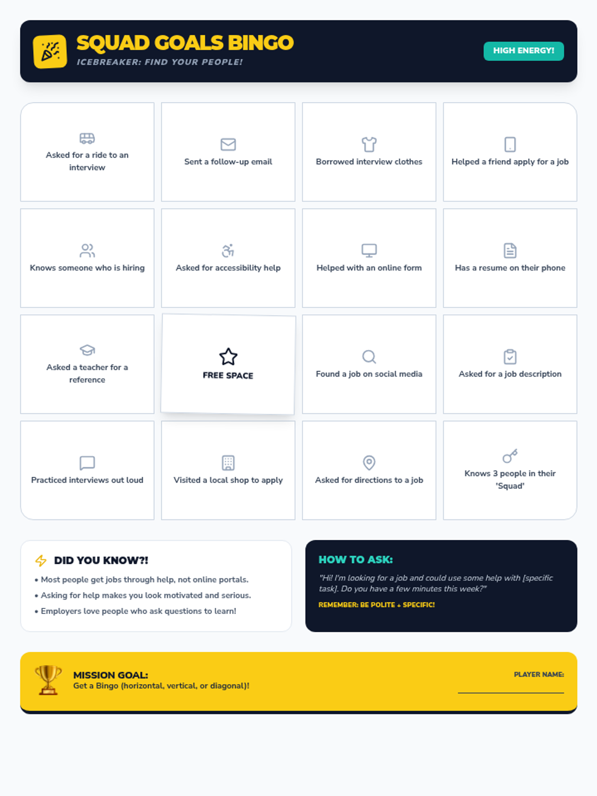 A high-energy 4x4 Bingo board used as an icebreaker to normalize help-seeking behaviors and spark conversation about job-search experiences.