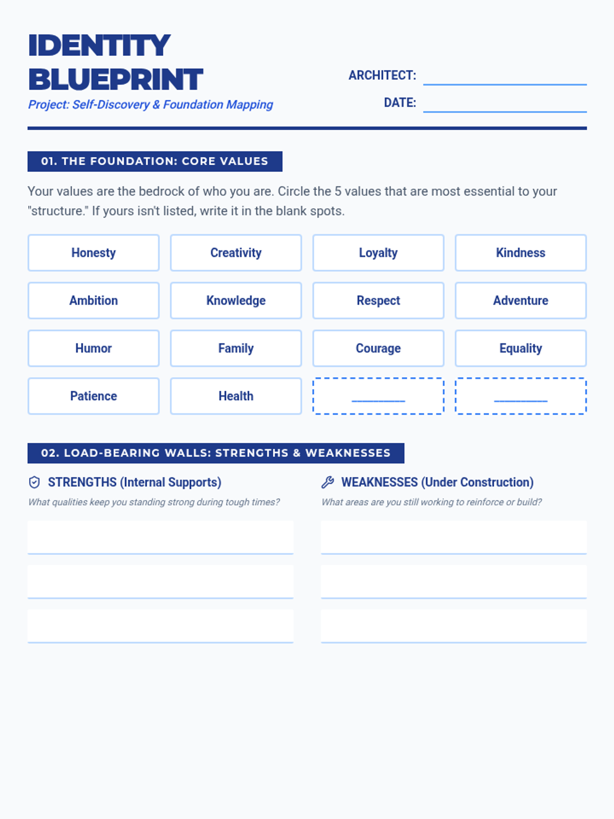 A creative 8th-grade worksheet using an architectural blueprint theme to help students map their core values, strengths, weaknesses, and self-perception.
