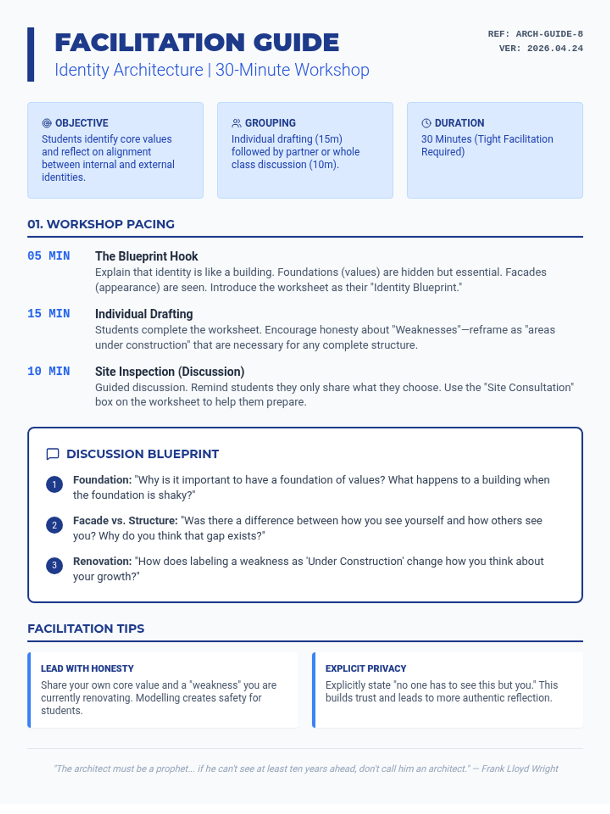 A comprehensive facilitation guide for the 30-minute Identity Architecture activity, including pacing, discussion prompts, and instructional tips.