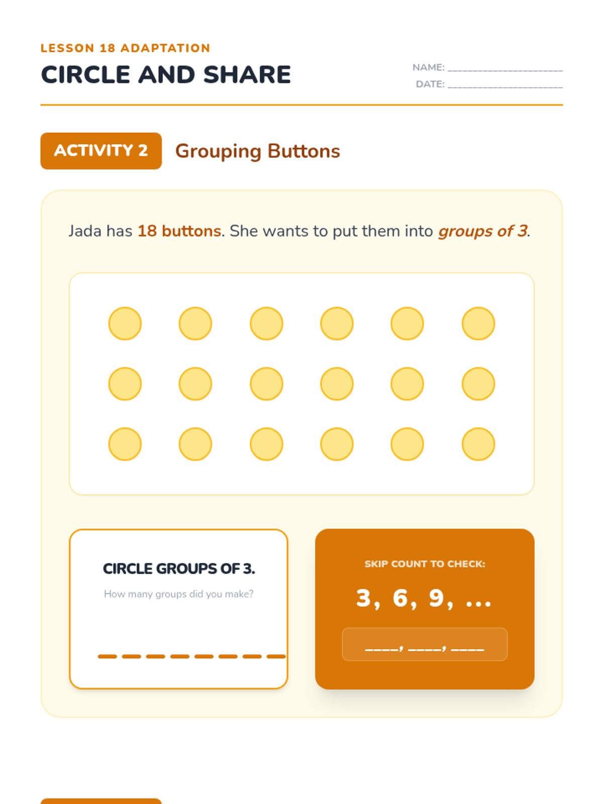 Revised Lesson 18 adaptation with enforced page breaks, improved layout for the matching activity to prevent confusion, and widened skip-count areas for better handwriting space.