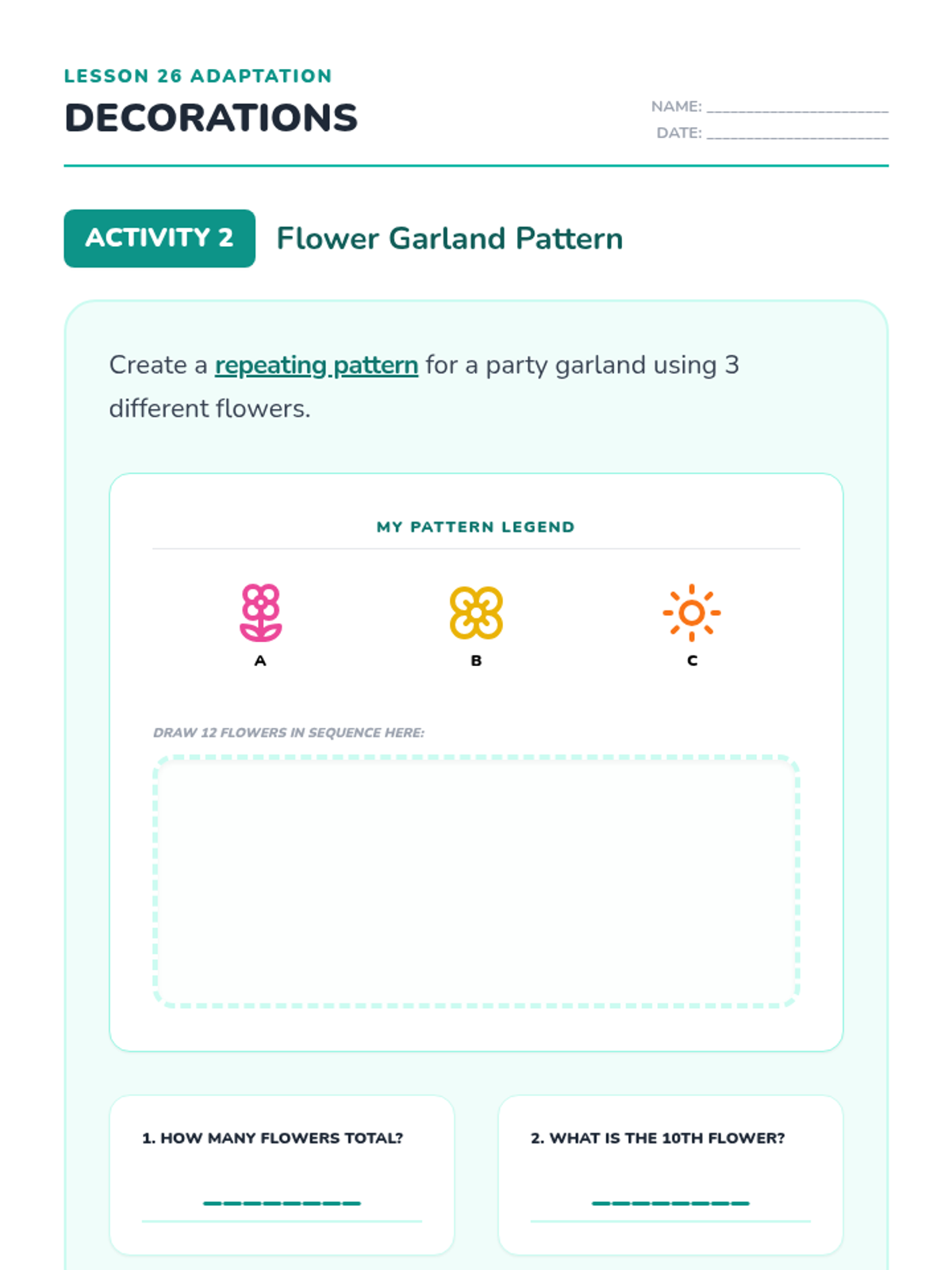 Revised Lesson 26 adaptation with corrected page breaks, significantly larger drawing areas for Grade 2 students, improved contrast in the legend, and white backgrounds for answer areas to ensure legibility.
