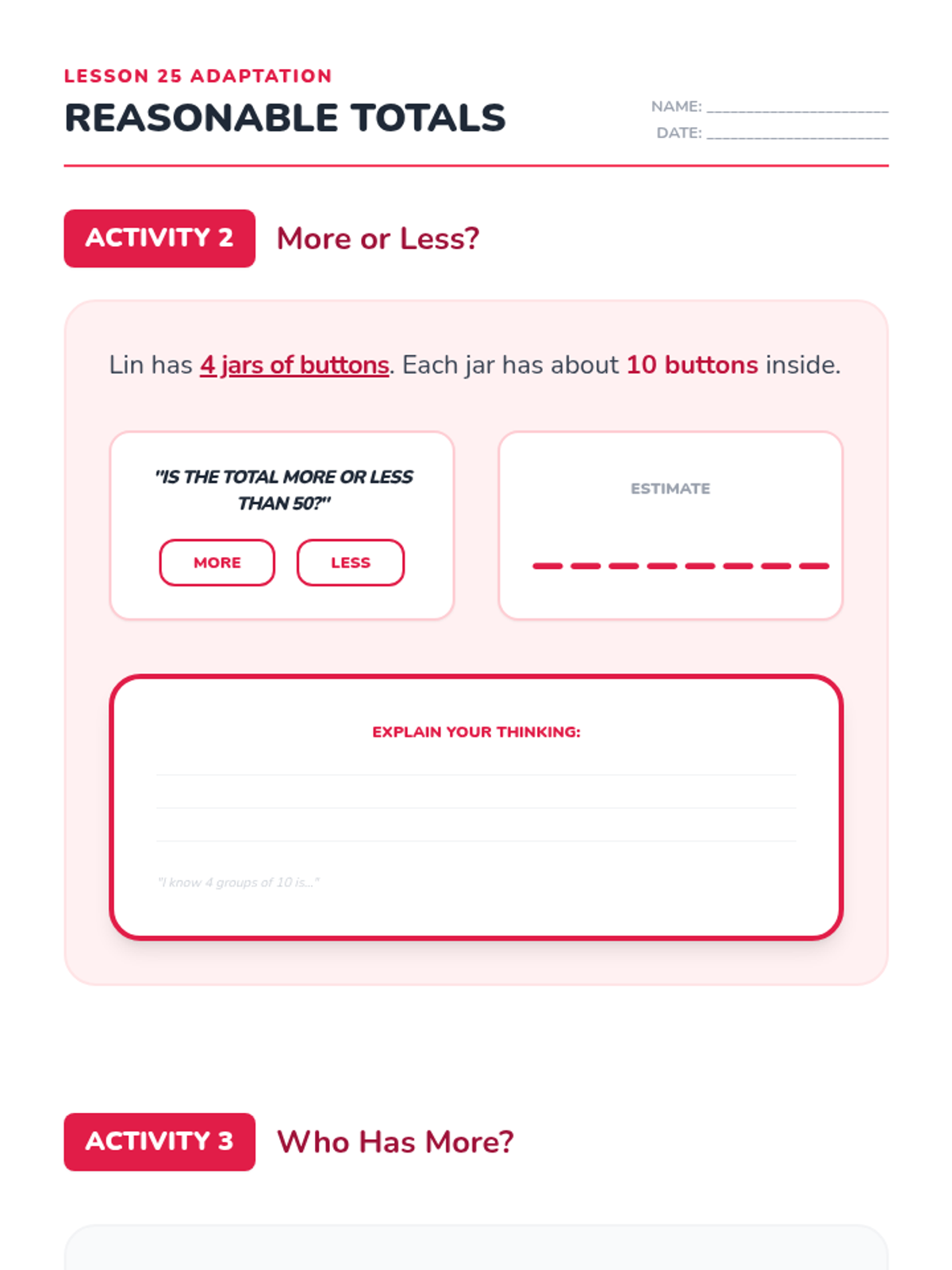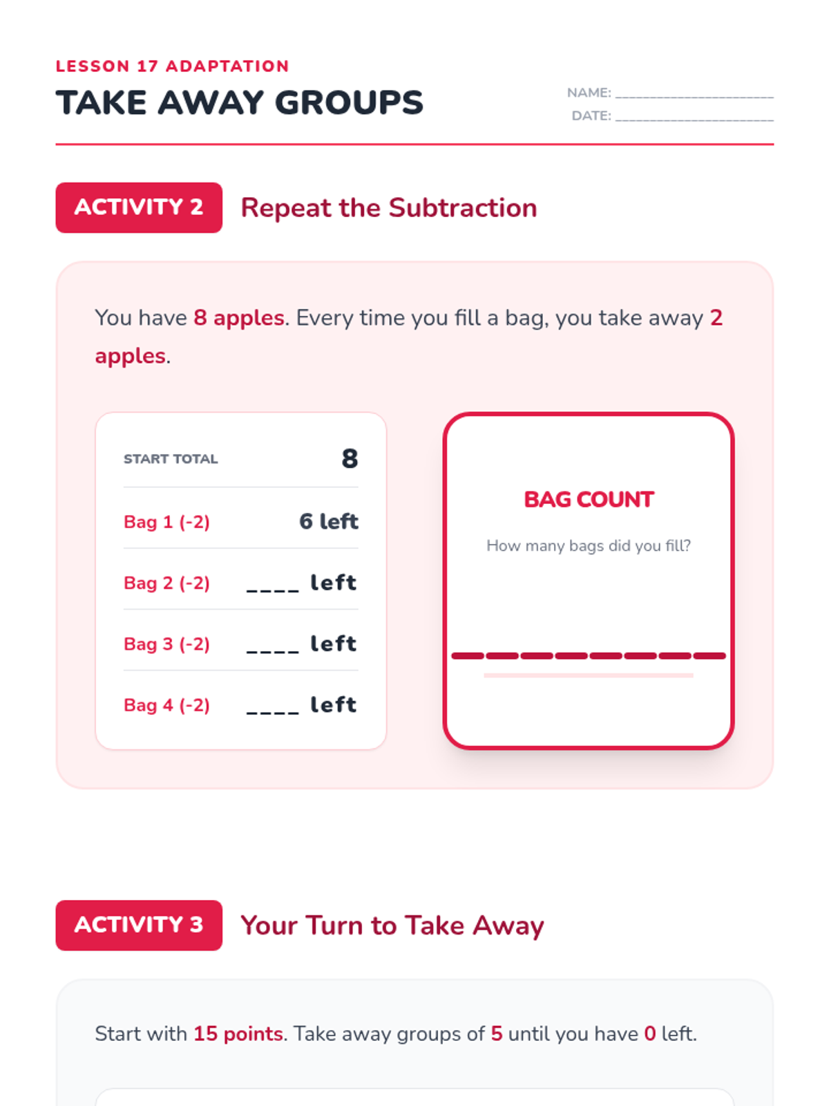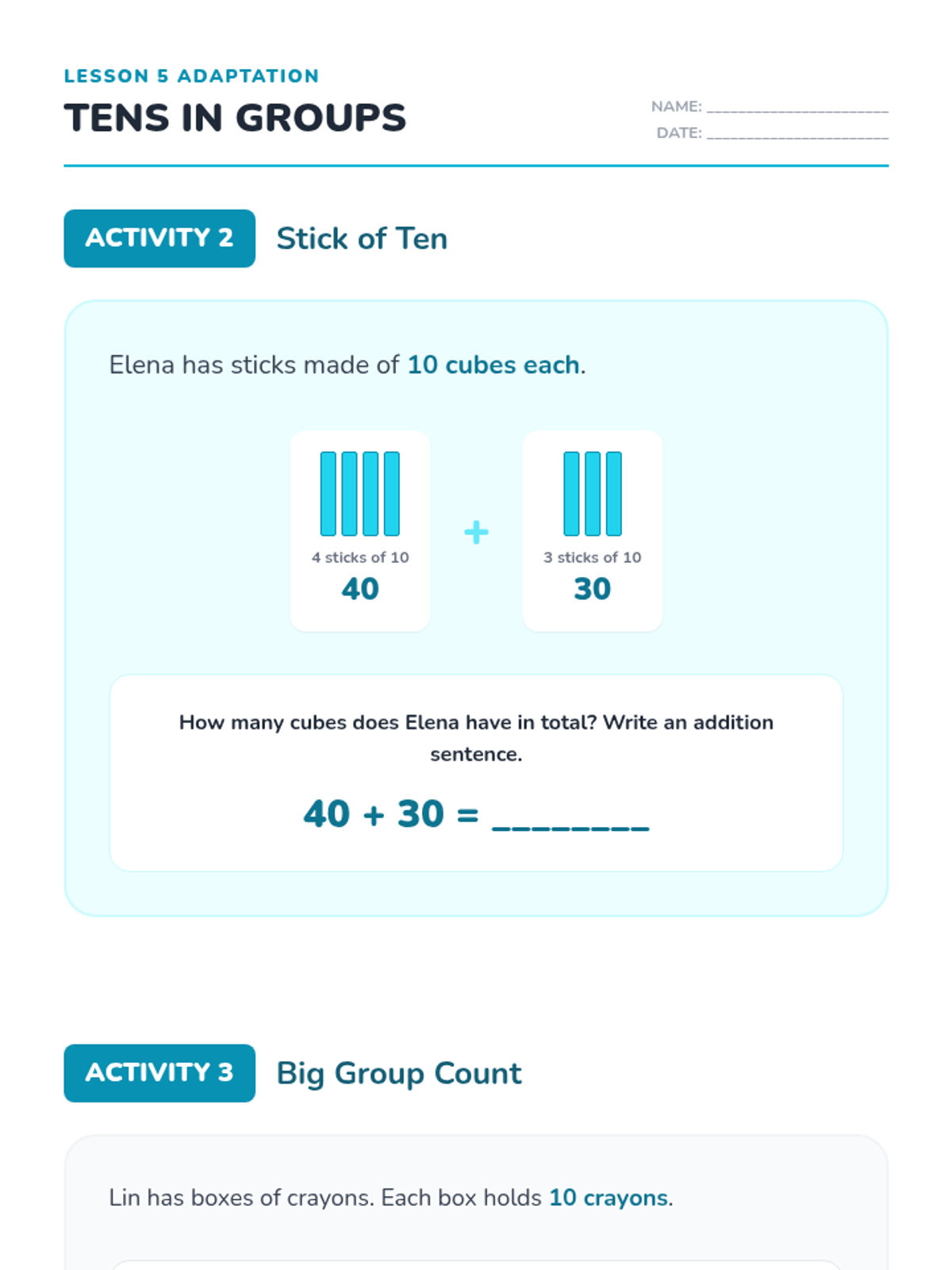 Revised Lesson 5 adaptation with corrected page breaks for Activity 3, improved handwriting legibility with light backgrounds for answer areas, and bolder skip-counting lines.
