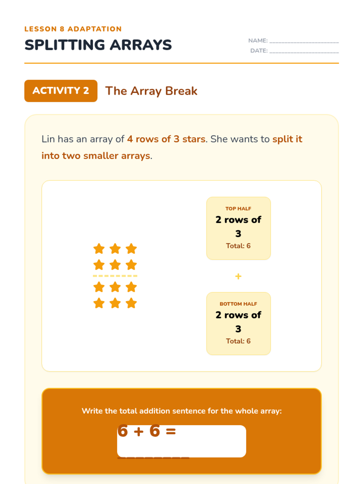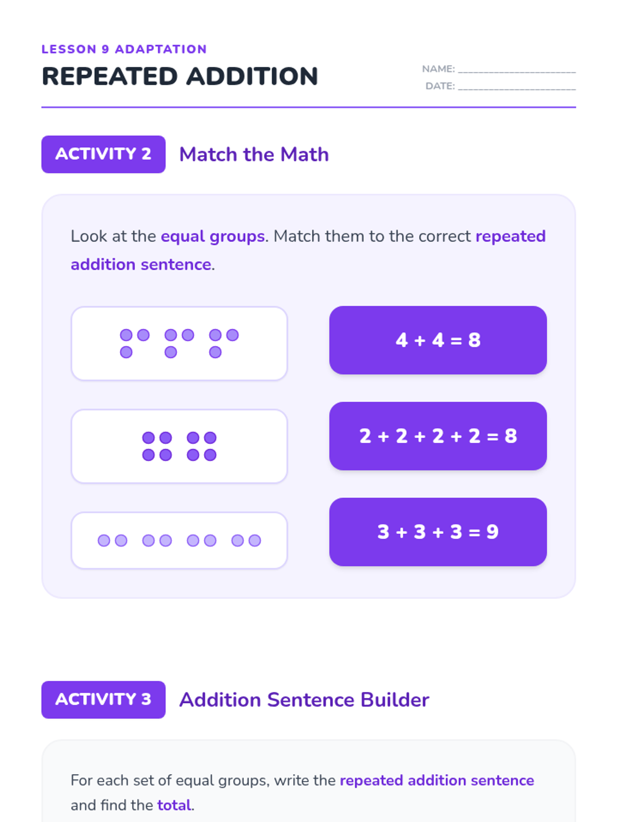Revised Lesson 8 adaptation with corrected visual arrays for student reference, improved page breaks, and higher contrast labels and answer lines for better accessibility.