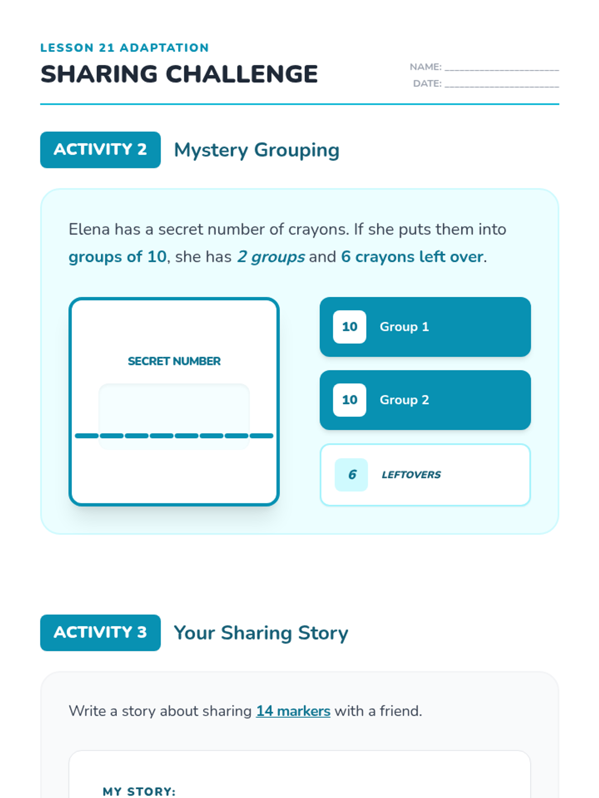 Revised Lesson 21 adaptation with corrected page breaks, added ruled writing lines for story creation, and improved text contrast for better legibility for young students.