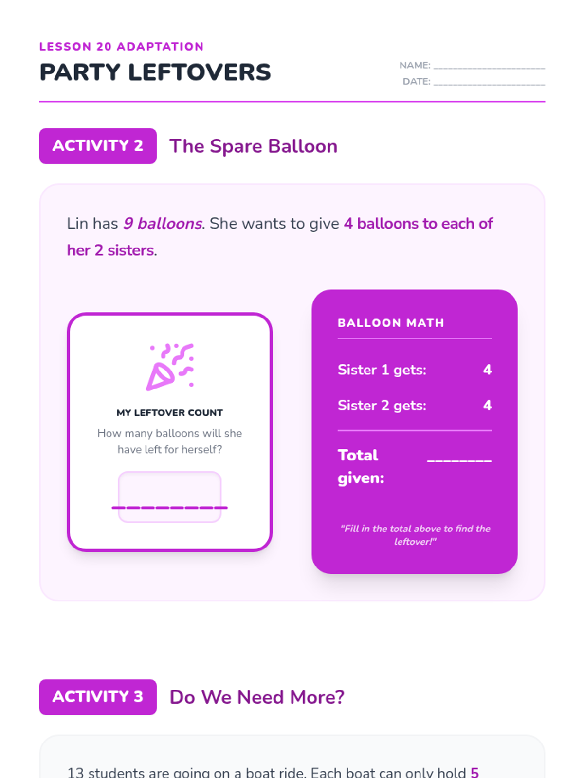 Revised Lesson 20 adaptation with enforced page breaks, removed accidental answers, increased font sizes for accessibility, and added ruled writing lines for student explanations.